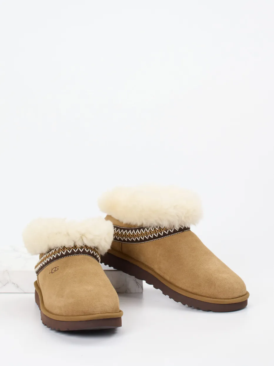 Design trifft Hygge-Ambiente.UGG interpretiert klassische Hausschuhe neu: Dieser Damen-Slipper aus Veloursleder kombiniert Komfort mit einem Hauch nordischem Chic. Ob zum entspannten Lesenachmittag oder dem gemütlichen Kaffeegenuss auf der Terrasse – das hellbraune Veloursleder erhält durch seine matte Oberfläche sowie das weiche Lammfellfutter eine besonders edle Haptik. Die geschlossene, rund geformte Silhouette mit Zickzackborte in Wollweiß und Dunkelbraun verleiht dem Hausschuh einen Vintage-Twist. Dank griffiger Gummisohle lässt sich der Look auch im Garten oder auf Balkonwegen tragen. Ein wohliger Begleiter für „Quiet Luxury“-Liebhaberinnen. UGG überzeugt mit markentypischer Qualität und nordischer Gemütlichkeit.
