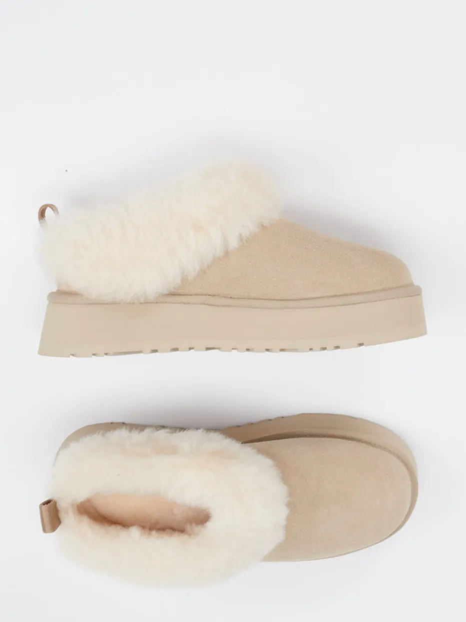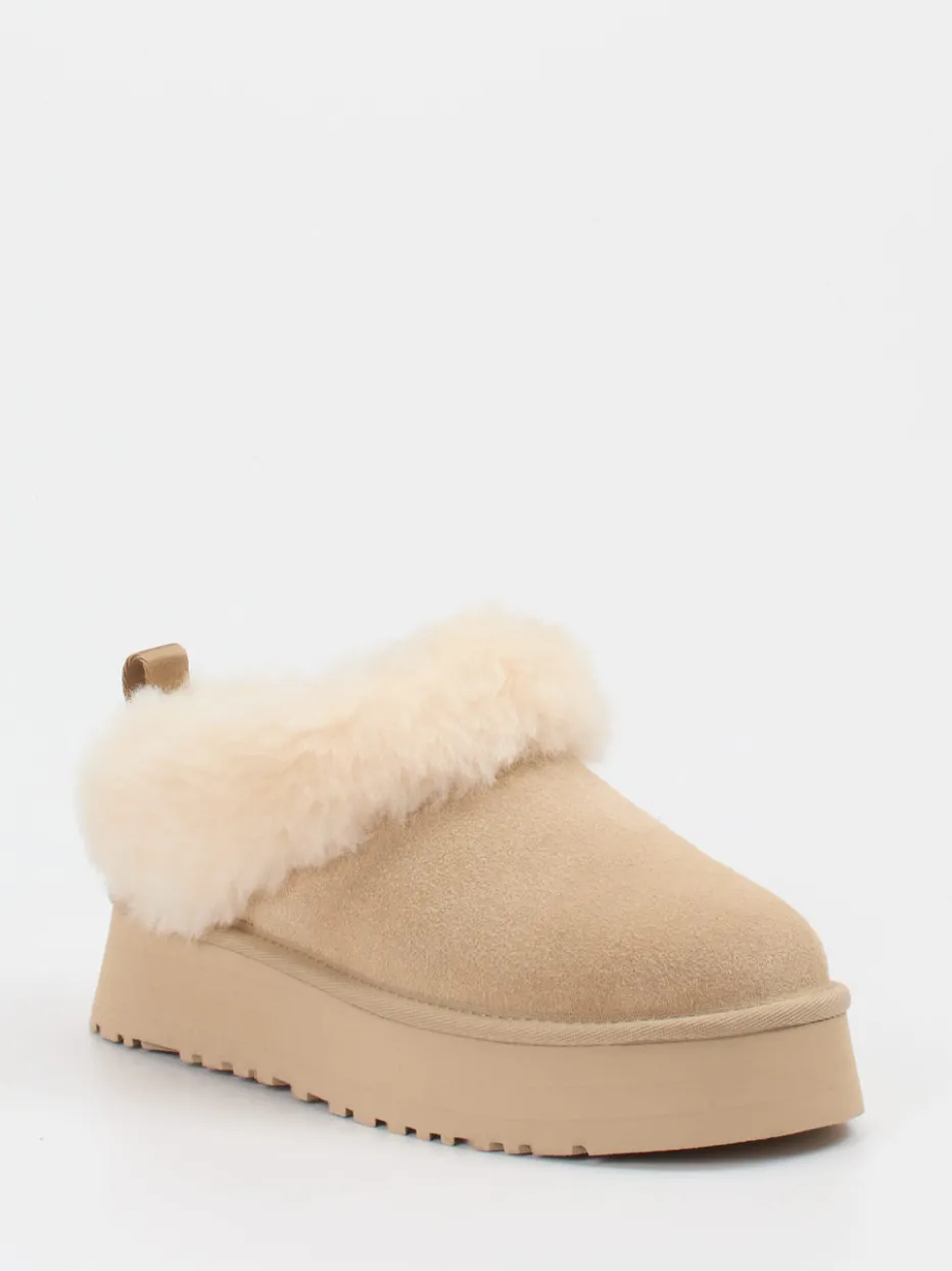 Kuscheliger Begleiter für kalte Tage.Der Damenhausschuh von UGG kombiniert modischen Anspruch mit behaglichem Tragekomfort. Ideal für ruhige Abende zu Hause oder entspannte Wochenendmomente: Das beige Veloursleder wirkt edel und wird durch flauschiges, cremeweißes Lammfell stilvoll ergänzt. Die rund geschlossene Form mit mattem Finish und sichtbarer Fellkante ist puristisch, aber modern. Die profilierte Plateausohle gibt Halt und bringt einen frischen Loungewear-Twist. Dank Schlupfform und praktischer hinterer Zuglasche punktet er auch funktional. Harmoniert hervorragend mit gemütlichen Strick-Teilen oder weiten Loungepants. Warme Qualität und authentische Materialanmutung – typisch UGG.