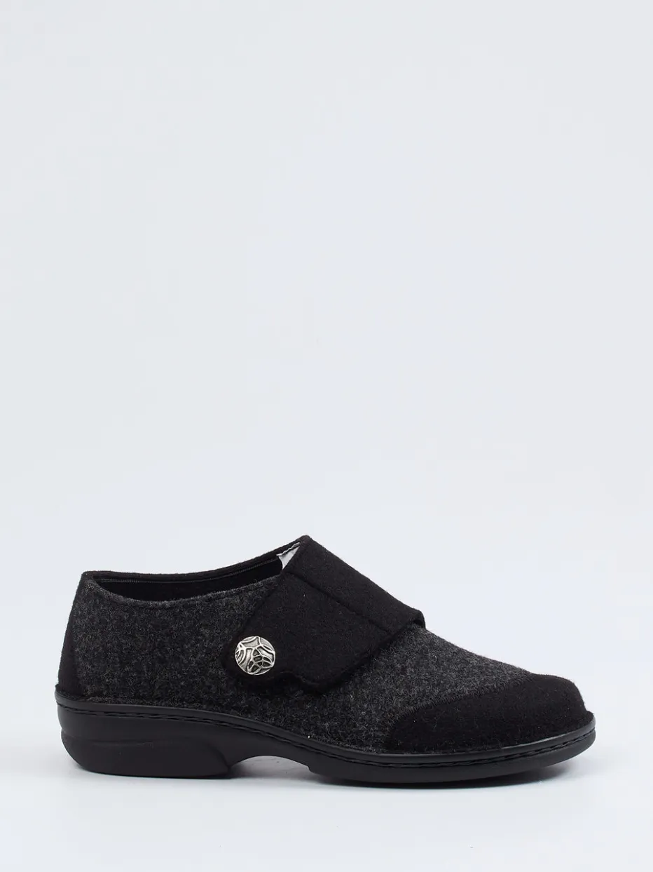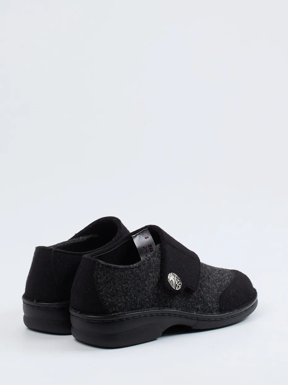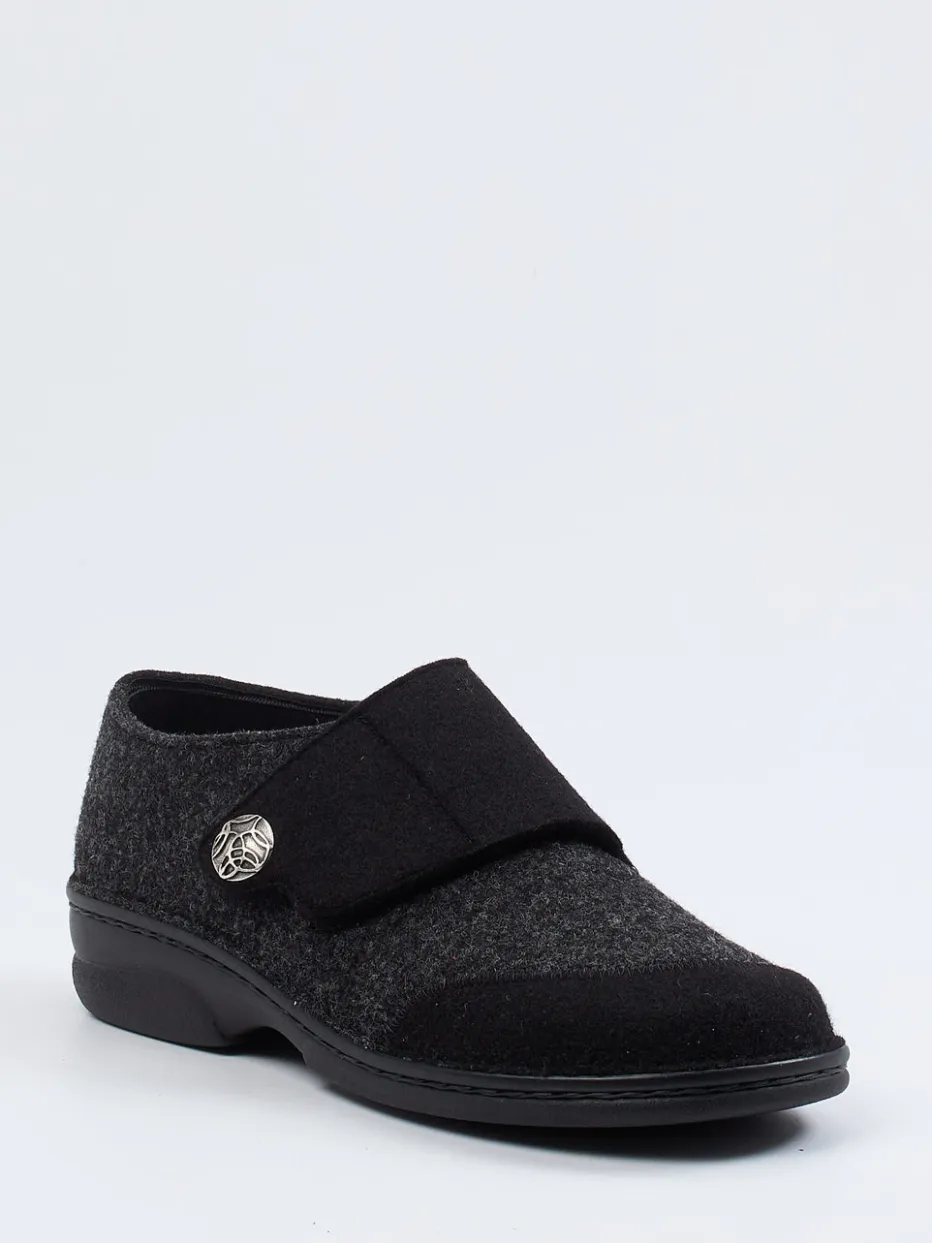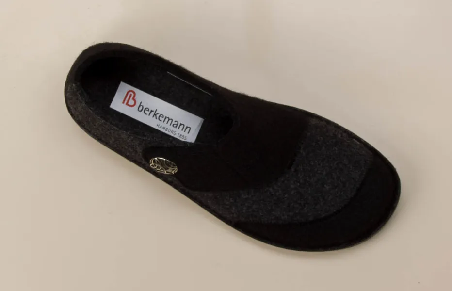 Wohlfühl-Design mit funktionalem Detail.Der Damen-Hausschuh von Berkemann verbindet Komfort und dezente Eleganz. Ideal für entspannte Stunden zu Hause: Das Modell aus warmer Wolle zeigt sich in Anthrazitgrau mit schwarzem Akzent und punktet mit einer klaren, rund geschlossenen Form. Der breite Klettverschluss ermöglicht einen bequemen Einstieg, unterstützt durch den dekorativen Metallknopf mit floraler Prägung. Ergonomische Gummisohlen mit leichter Rutschhemmung bieten sicheres Gehen auf glatten Böden. Visuell minimalistisch gehalten, greift der Schuh aktuelle „Quiet Luxury“-Tendenzen auf. Pflegeleichte Funktionalität trifft auf stilvolle Zurückhaltung – typisch Berkemann.