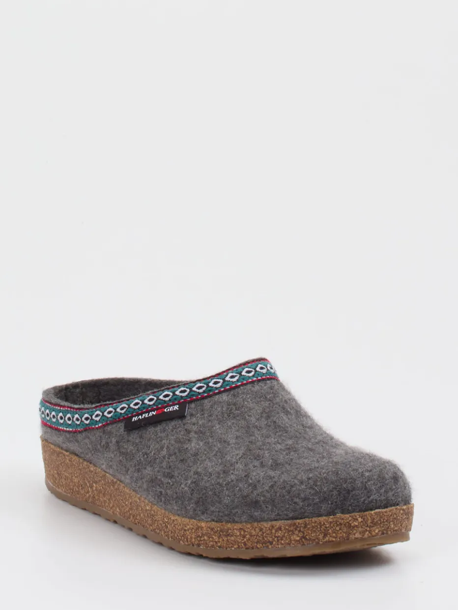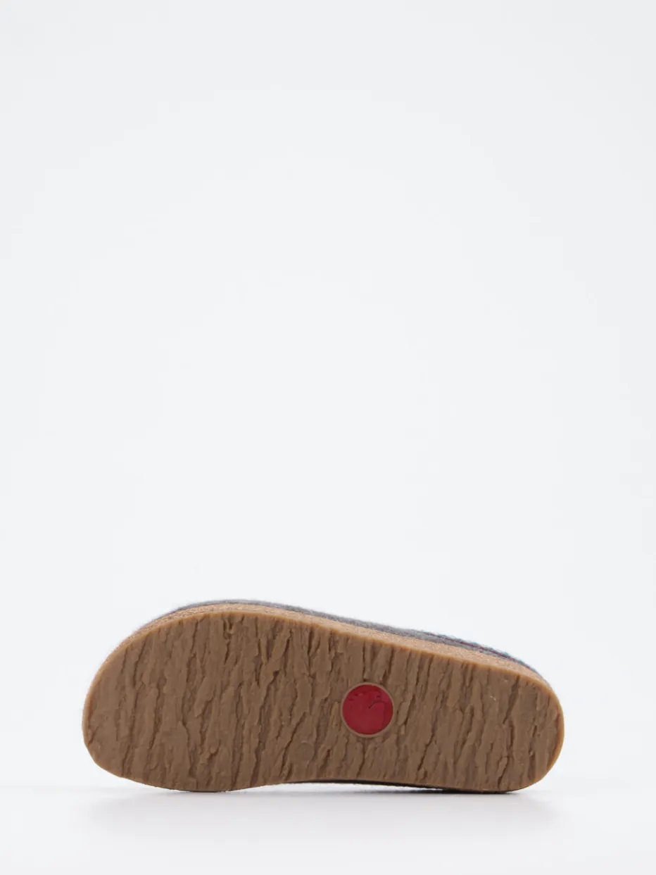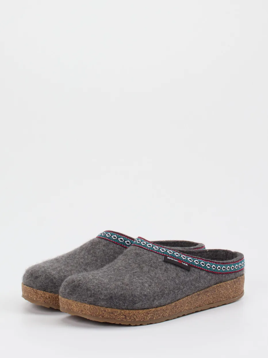 Wohlfühlen beginnt mit den Füßen.Haflinger präsentiert mit diesem Hausschuh eine gemütliche Lösung für entspannte Stunden daheim. Ideal für kühle Böden und ruhige Abende: Der geschlossene Pantoffel aus grauem Wollfilz sorgt dank seiner filzigen Oberfläche für ein angenehmes Fußklima. Das anatomisch geformte Fußbett aus Kork und die griffige Profillaufsohle aus Gummi bieten Stabilität und Komfort. Eine bunte Borte mit Ethnomuster setzt visuelle Akzente im alpinen Stil. Der offene Fersenbereich erleichtert das Hineinschlüpfen – ganz ohne Verschluss. Das Modell passt perfekt zu Loungewear oder Stricksocken. Haflinger steht für natürliche Materialien, nachhaltige Verarbeitung und zeitlose Hausschuhkultur.