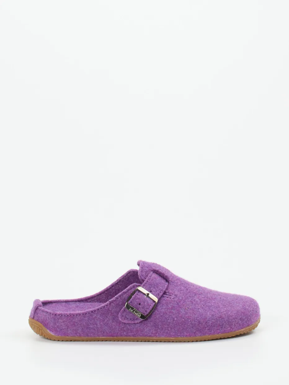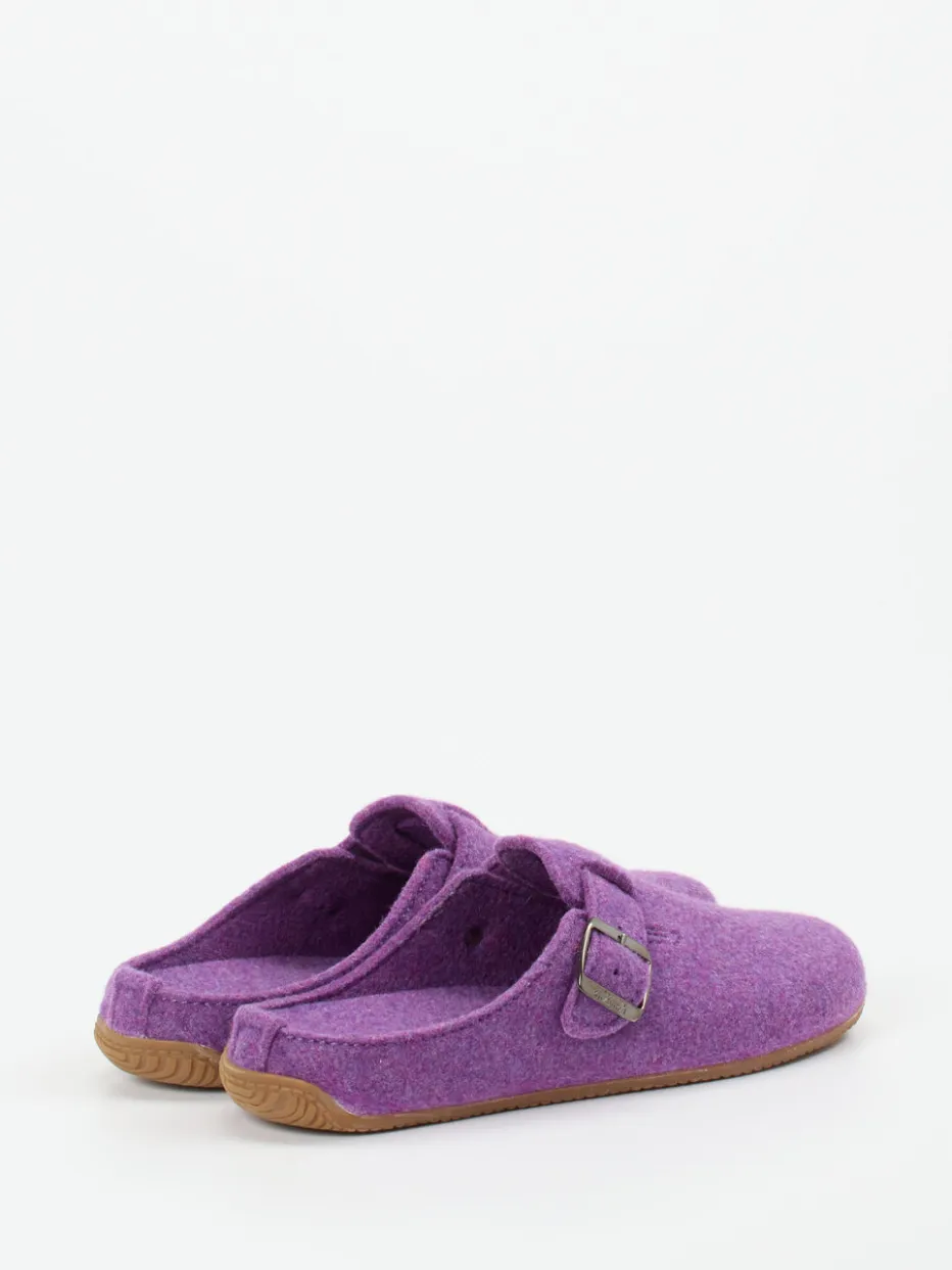 Der fliederfarbene Hausschuh aus filzigem Wollfilz vereint zurückhaltenden Stil mit funktionalem Komfort – perfekt für die ruhigen Momente zuhause.