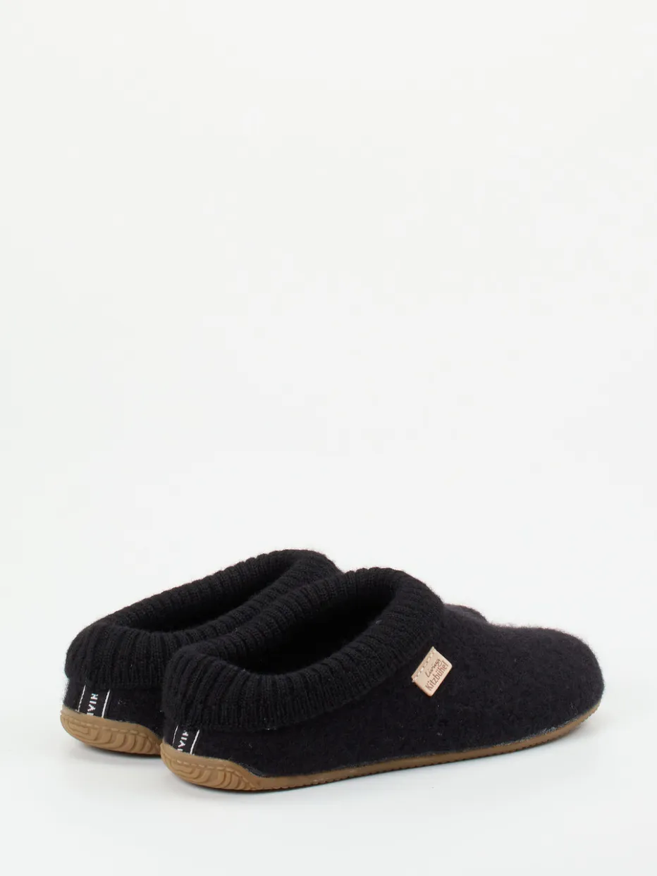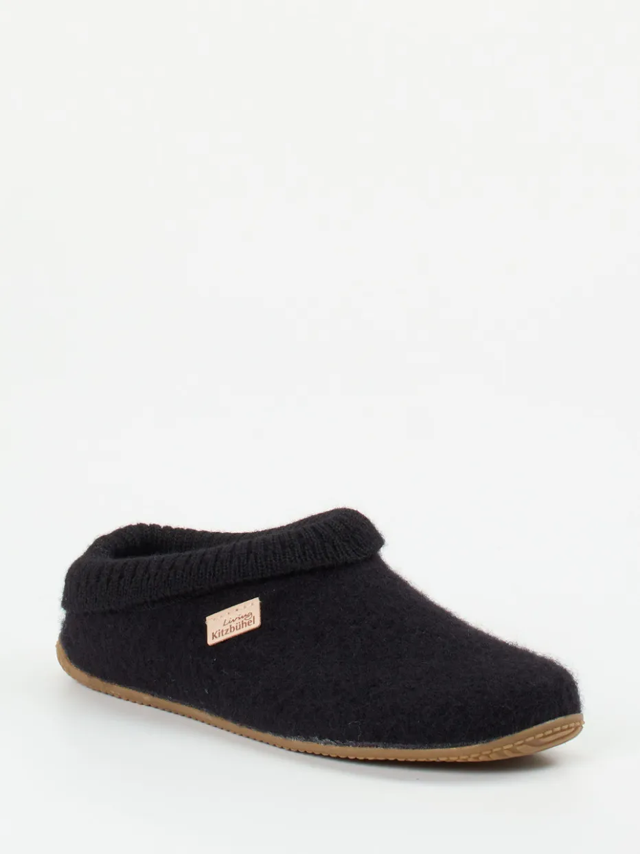Behaglichkeit für kalte Tage.Living Kitzbühel präsentiert einen Hausschuh, der Wärme und Komfort vereint. Perfekt geeignet für gemütliche Stunden daheim: Der schwarze Wollfilz umschließt den Fuß weich und klimaregulierend, während das elastische Rippbündchen für sicheren Halt am Einstieg sorgt. Die glatte, niedrig geschlossene Form sitzt bequem und feminin. Markendetails wie das dezente Label und die honigfarbene, rutschfeste Gummisohle setzen stilvolle Akzente und unterstützen einen sicheren Auftritt. Inspiriert vom Cottagecore-Trend, passt der Look ideal zu Loungewear – ob mit Strickhose oder Kuschelsocken. Ein echter Wohlfühlklassiker mit alpiner Handschrift.