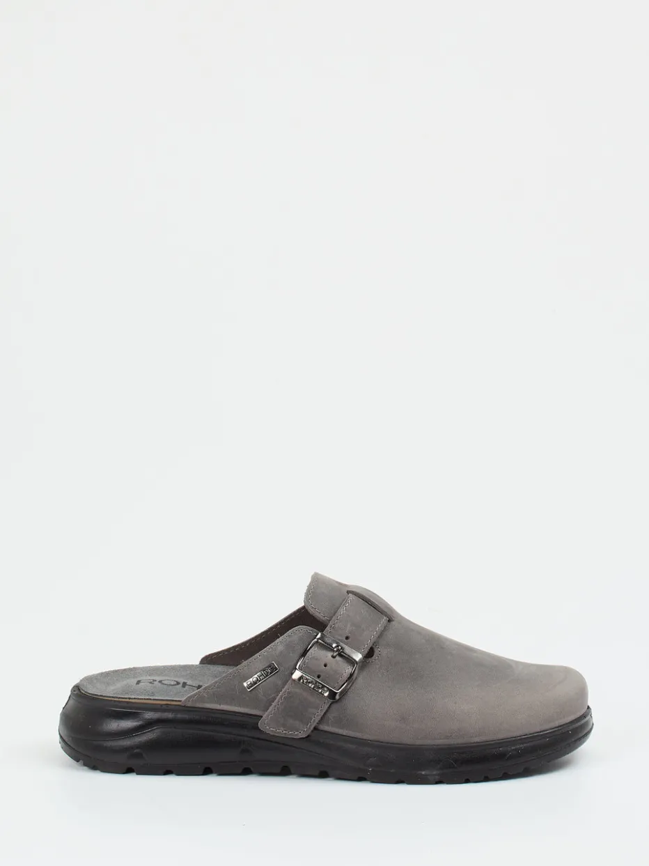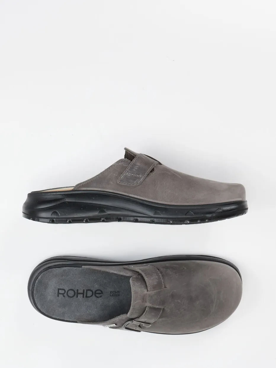 Schlichte Klasse für den Alltag.Rohde zeigt mit dieser Pantolette eine komfortorientierte Interpretation des klassischen Hausschuhs. In ruhigen Momenten daheim überzeugt der Clog durch sein samtig strukturiertes Kalbleder in mittlerem Grau. Die ergonomisch ausgeformte, lederbezogene Innensohle ist weich gepolstert und unterstützt ein angenehmes Tragegefühl. Eine verstellbare, silberfarbene Metallschnalle sorgt für optimalen Sitz, während die profilierte Gummisohle mit Shock-Absorber auch kurze Wege nach draußen mitmacht. Der minimalistische Look unterstreicht den „Quiet Luxury“-Trend auf dezente Weise. Kombiniert mit Fleece oder Strick entsteht ein hochwertiger Relax-Stil. Ein Hausschuh, der Komfort mit funktionalem Design stilvoll verbindet.