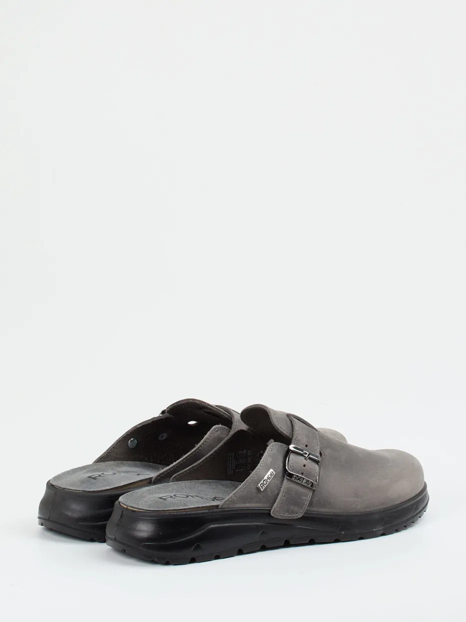 Ein ergonomisch geformter Clog mit komfortorientierter Ausstattung, gefertigt aus robustem Kalbleder in elegantem Grau. Ideal für entspannte Stunden zuhause.
