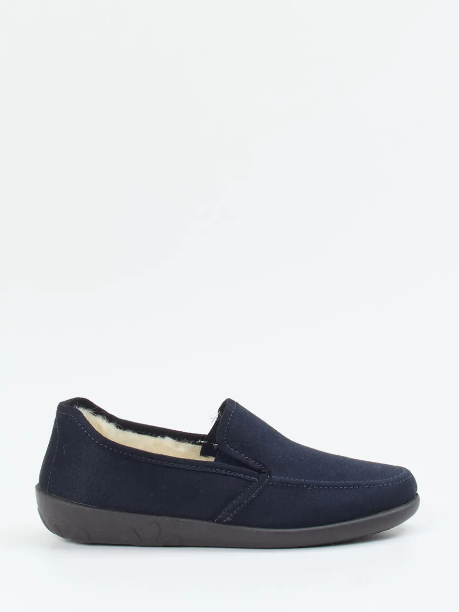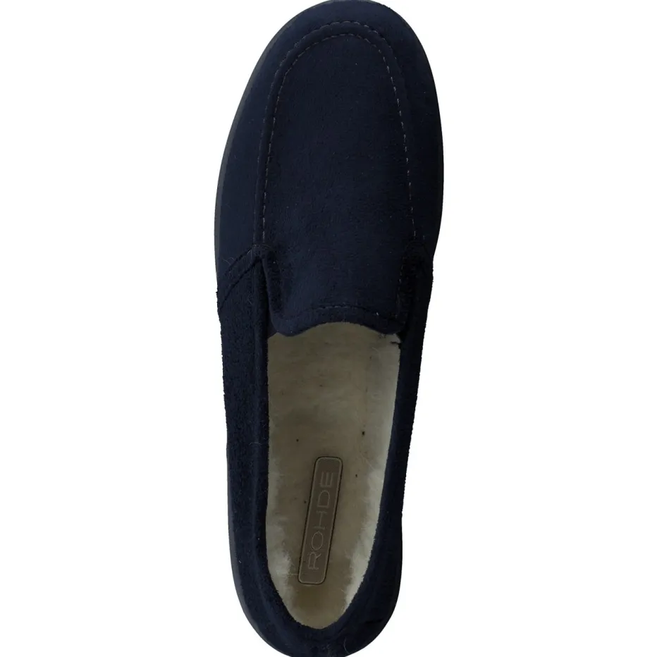 Wärme trifft auf Schlichtheit.Rohde präsentiert mit diesem Hausschuh einen klassischen Damen-Slipper für entspannte Momente. Ideal für kalte Winterabende sorgt das dunkelblaue Textilmaterial in matter Optik für ein angenehm weiches Tragegefühl. Das flauschige Innenfutter aus Kunstfell wärmt zuverlässig, während seitliche Elastikeinsätze ein bequemes Hineinschlüpfen ermöglichen. Die leicht profilierte Kunststoffsohle bietet Rutschsicherheit auf glatten Böden. Der rund geschlossene Schnitt und das zurückhaltende Design betonen den Fokus auf Funktionalität und Wohnkomfort – inspiriert von Loungewear-Trends. Zuverlässige Gemütlichkeit mit dem Komfortanspruch von Rohde.