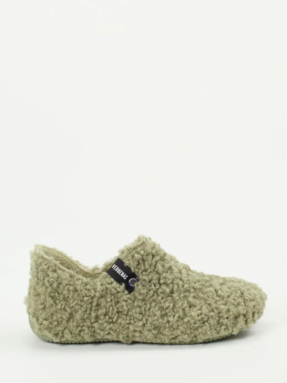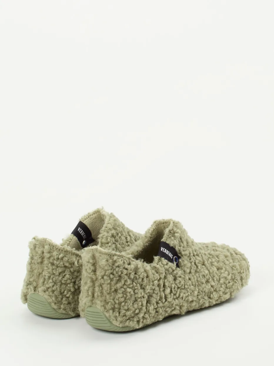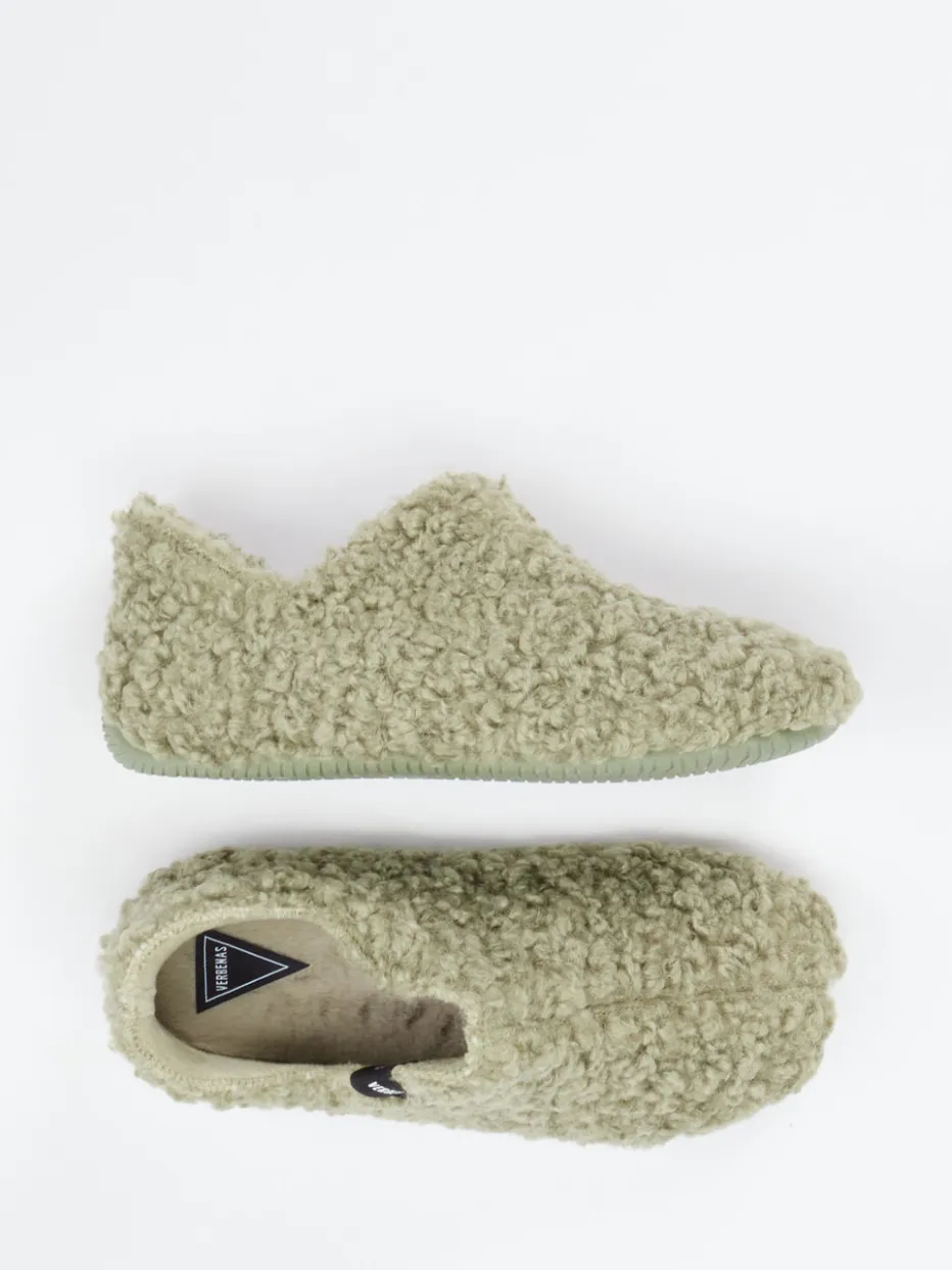 Sanfter Komfort für Zuhause.Die spanische Marke Verbenas präsentiert komfortorientierte Hausschuhe im modischen Slipper-Stil. Weiche Textilmaterialien in samtiger Felloptik umhüllen den Fuß in Salbeigrün – ideal für entspannte Stunden auf dem Sofa. Die runde, geschlossene Form mit elastischem Schlupfeinstieg lässt sich unkompliziert tragen. Ein Ton-in-Ton-Design mit dezentem Textil-Label verleiht dem Paar minimalistischen Charakter. Die profilierte Gummisohle bietet zuverlässige Rutschhemmung auf glatten Böden. Ein echtes Cozy-Comfort-Piece mit Loungewear-Anmutung. Verbenas kombiniert anspruchsvolle Verarbeitung mit alltagstauglicher Gemütlichkeit.
