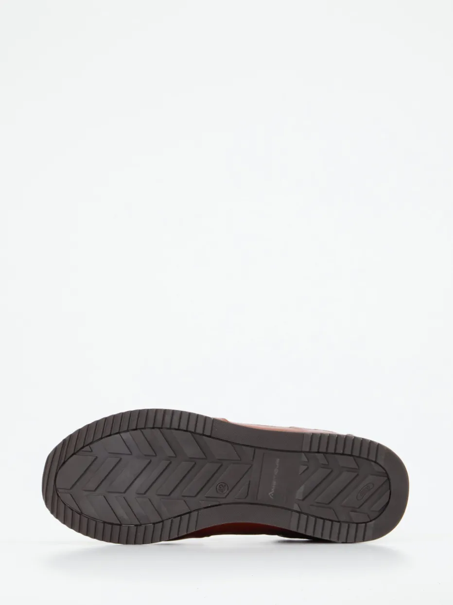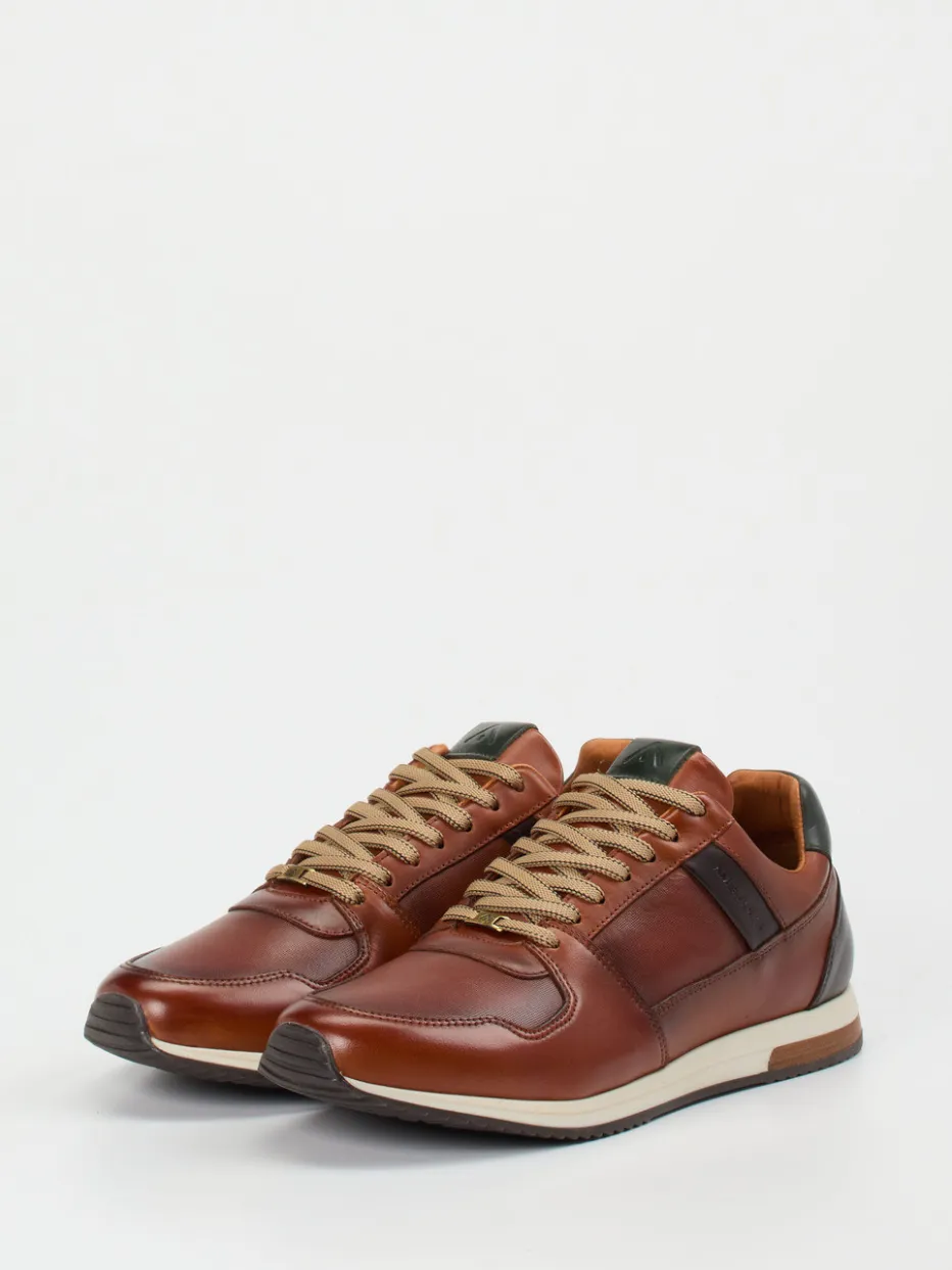 Business-Charme mit sportivem Twist.Ambitious interpretiert den Herren-Sneaker neu – aus geschmeidigem Kalbleder gefertigt. Ideal für Tage, an denen Komfort und Stil gefragt sind. Der cognacbraune Schuh verbindet glänzendes Kalbleder mit dunkelgrünen und schwarzbraunen Overlays, ergänzt durch prägnante Kontrastnähte. Die klassisch-sportliche Silhouette mit Schnürung und gepolsterter Ferse bietet Halt, während das Innenfutter aus weichem Kalbleder und ein Wechselfußbett hohen Tragekomfort garantieren. Eine weiße, rutschfeste Gummisohle sorgt für dynamische Bodenhaftung. Modisch bewegt sich der Schuh zwischen „Quiet Luxury“ und Retro-Sportstil. Passt perfekt zu Chinos und Strickpullover. Ambitious steht hier für alltagsgerechtes Design mit hochwertigem Lederhandwerk.