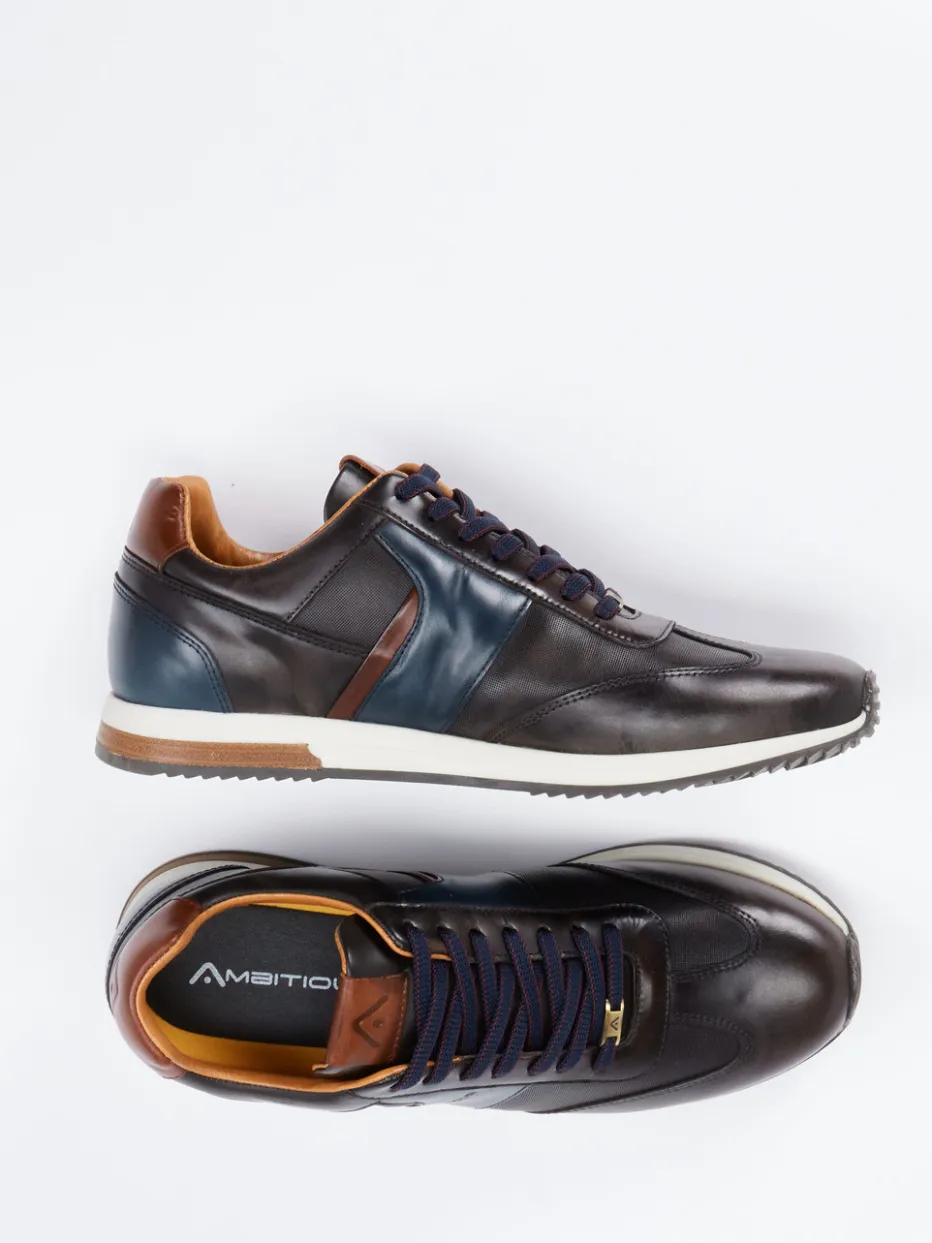 Retro trifft smarte Eleganz.Ambitious präsentiert stilvolle Herren-Sneaker im klassischen Low-Top-Design. Ideal für Casual-Fridays oder stilvolle Wochenendlooks: Der Materialmix aus hochwertigem Kalbleder und textilen Partien überzeugt durch eine glänzende Oberfläche und strukturierte Farbkontraste in Navyblau und Cognacbraun. Die klassische, schmale Silhouette wird durch zweifarbige Schnürsenkel mit Metall-Detail ergänzt. Eine profilierte Gummisohle mit Zickzackmuster und ein gepolsterter Schaftrand sorgen für Komfort im Alltag. Designinspirierte Elemente aus Retro Running und aktuelle Color-Blocking-Trends machen den Look zeitgemäß. Vielseitig kombinierbar zu Denim oder Wollhose. Ein hochwertiger Urban-Sneaker mit modischem Anspruch und eleganter Verlässlichkeit.