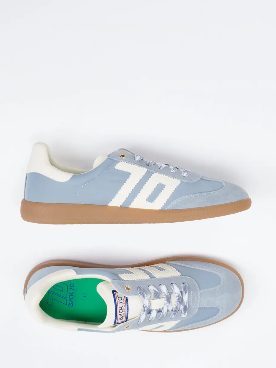 Ideal für City-Walks oder Urlaubstage vereint der Sneaker Pastellblaues Veloursleder, samtige Nylon-Einsätze und ein detailreiches Kroko-Logo auf der Seite. Die flache Silhouette wird durch goldfarbene Ösen, zweifarbige Schnürung und eine profilierte Gummisohle ergänzt. Dank Memory-Foam-Fußbett und gepolstertem Fersenbereich überzeugt er auch funktional. Stilistisch trifft Vintage 90s auf aktuellen Streetwear-Trend.
