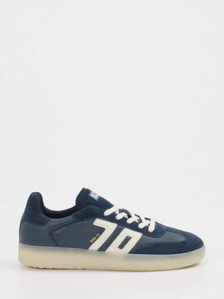 Back 70 zeigt mit diesem Sneaker eine sportlich-legere Option für Alltag und Freizeit. Gefertigt aus Veloursleder und Leder, greift das Modell den Retro-Sportswear-Trend auf. Die klassische flache Silhouette in Navyblau wird durch cremeweiße Akzente und ein auffälliges weißes Markenlogo ergänzt. Die transluzente Gummisohle sorgt für ein modernes Finish. Dank Textilfutter bietet der Sneaker angenehmen Tragekomfort. Ob kombiniert zu Denim oder Jogpants – dieser Schuh passt in urbane Streetwear-Looks ebenso wie in sportliche Casual-Outfits. Ein trendstarkes Modell mit Vintage-Charme und hochwertiger Materialkombination.