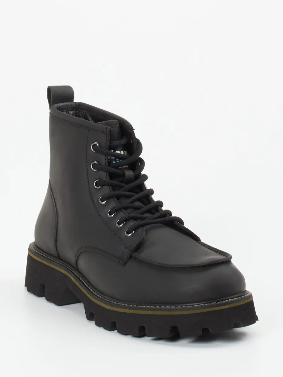Workwear-Flair trifft auf urbanen Komfort.Blauer präsentiert markante Schnürboots für die Herbst- und Wintersaison. Diese Modelle sprechen alle an, die zuverlässigen Halt und starken Stil für Alltag und Freizeit suchen. Gefertigt aus strapazierfähigem Kalbleder mit matter Oberfläche, überzeugt das robuste Obermaterial durch Langlebigkeit und klare Linien. Die schwarze Farbgebung wirkt zeitlos, während Gelb-Oliv-Kontrastnähte und Metallösen dezente Akzente setzen. Eine profilierte Chunky-Sohle aus Gummi sorgt für Trittsicherheit und passt in Workwear- wie Streetstyle-Umgebungen. Innen garantieren Leder und Textil angenehmen Tragekomfort. Kombinierbar zu Denim, Overshirts oder Outdoorjacken. Ein alltagstauglicher Begleiter mit konsequentem Stil und funktionalem Mehrwert.