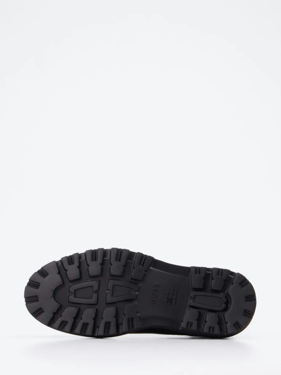 Diese Chelsea Boots von Boss verbinden fein genarbtes Kalbleder mit einer robusten Profilsohle – ein stilvoller Begleiter für urbanen Alltag und Business.