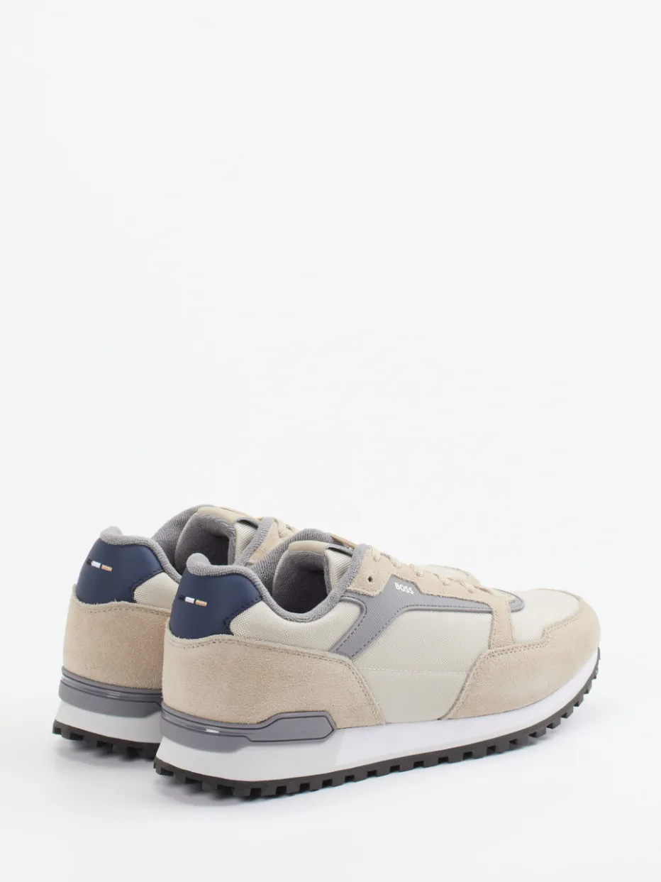 Retro-Design trifft auf modernen Komfort.Der Herren-Sneaker von Boss bringt klassische Runner-Flair in die Gegenwart. Für entspannte City-Walks oder einen sportlich inspirierten Tageslook überzeugt das Modell mit einem anspruchsvollen Mix aus Velour und Textil. Die kombiniert glatte und leicht genarbte Oberfläche sorgt zusammen mit tonalen Overlays in Beige sowie Akzenten in Grau und Dunkelblau für dezente Tiefe. Gepolsterter Schaft, profilierte Gummisohle und Schnürung garantieren Alltagstauglichkeit mit Komfort. Die Prägung auf Zunge und Seite ergänzt das ruhige Design authentisch. Ein vielseitiger Sneaker mit Sinn für reduzierte Ästhetik und hochwertige Verarbeitung.