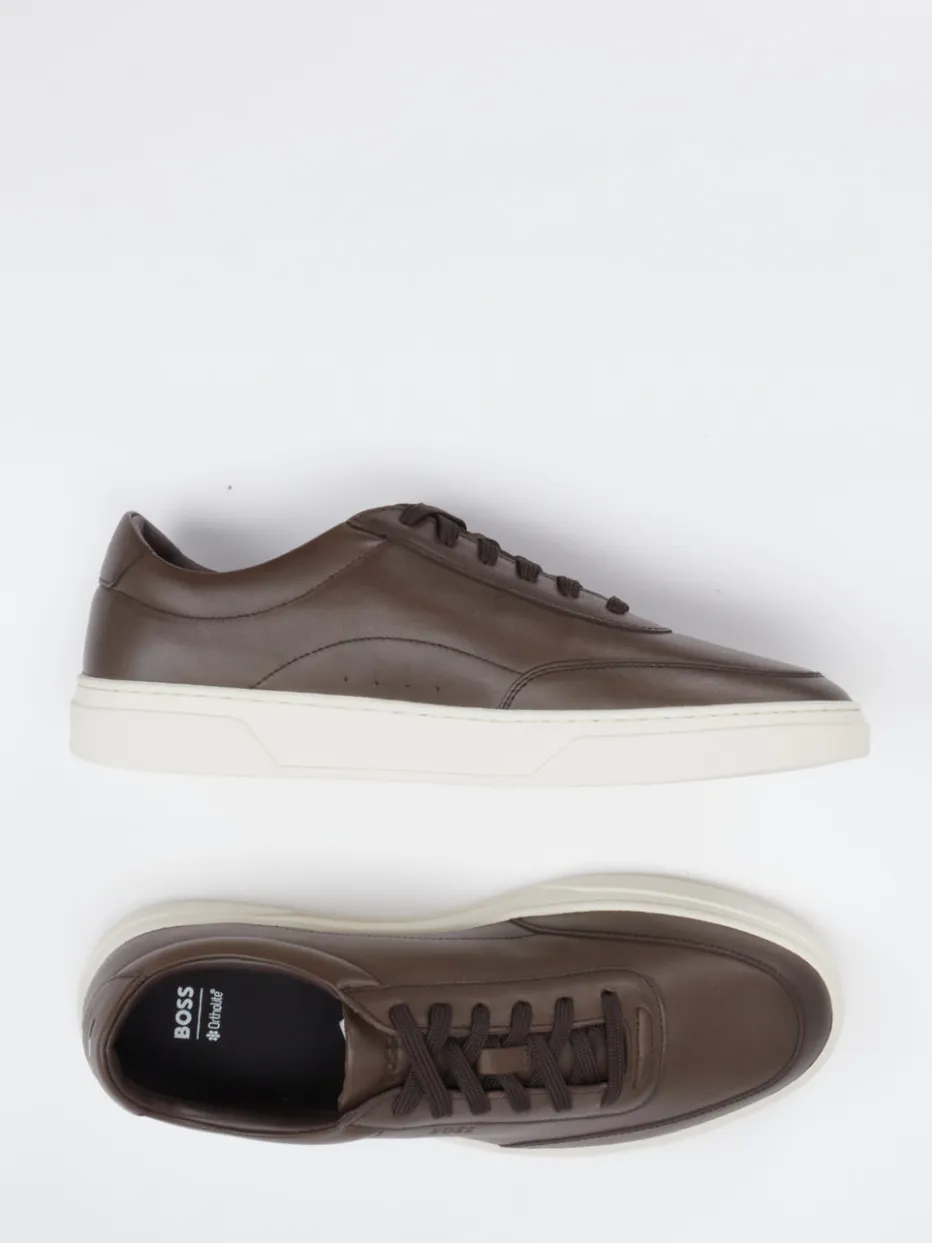 Cleanes Understatement im Alltag.Dieser Herren-Sneaker von Boss verbindet stilvolle Linienführung mit urbaner Schlichtheit. Für Tage, an denen stilvolle Vielseitigkeit gefragt ist: Das moccabraune Kalbleder mit matter Oberfläche wirkt in Kombination mit der beigen Gummisohle besonders modern. Die klassische Low-Top-Silhouette mit dezenten Ton-in-Ton-Nähten, geprägtem Seitenlogo und gepolstertem Schaftrand sorgt für Komfort und klare Ästhetik. Die Schnürung gibt sicheren Halt, das Textilfutter erhöht den Tragekomfort. Inspiriert von Streetwear und Quiet Luxury passt der Look zu Casual- wie Business-Outfits. Besonders stimmig mit Chino oder Wool-Slacks. Eleganz auf leisen Sohlen trifft Alltagstauglichkeit – im typischen Boss-Stil.