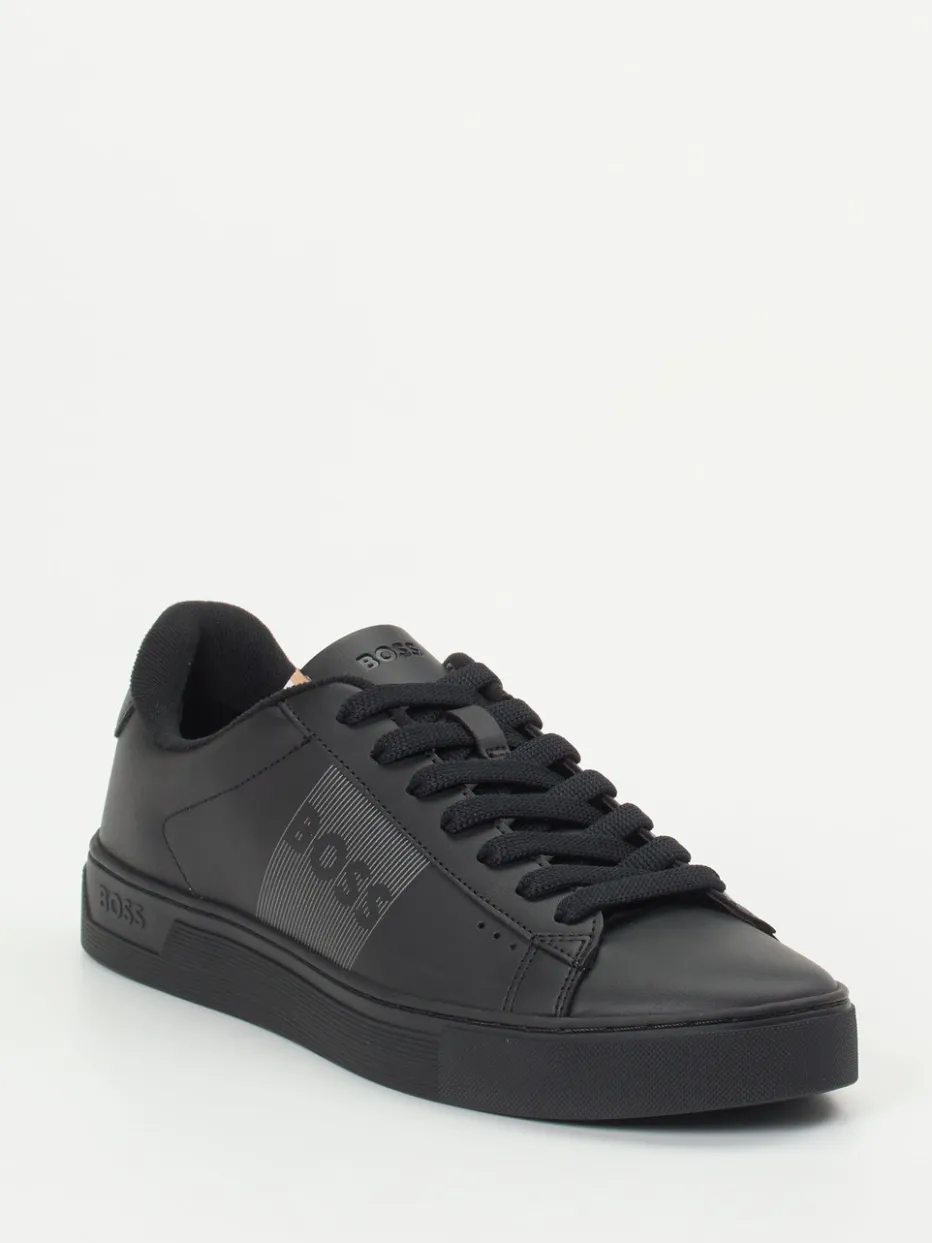 Der schwarze Kalbleder-Sneaker von Boss überzeugt mit minimalistischer Silhouette und monochromem Design – ideal für urbane Looks mit komfortabler Vielseitigkeit.