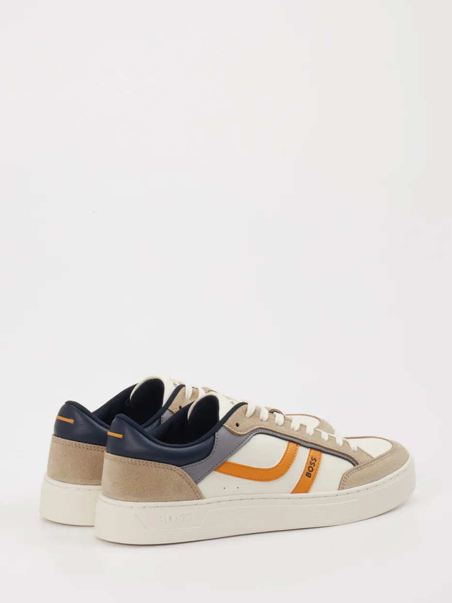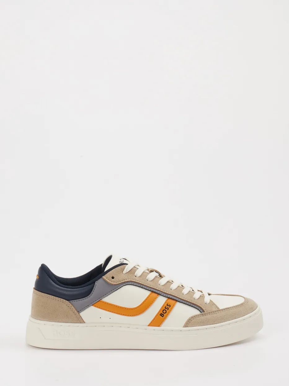 Modernes Color-Blocking trifft Retro-Design. Mit diesen Low-Top Sneakern von Boss zeigt sich modische Lässigkeit in Bestform. Ideal für entspannte Freizeitmomente, verbindet das Modell Velour- und Glattleder zu einer spannenden Materialkombination. Der cremeweiße Grundton wird durch Kontraststreifen in Orange, Beige und Dunkelblau akzentuiert. Die klassische, flache Silhouette, eine markentypische Logoprägung an Ferse und Außensohle sowie farblich abgesetzte Overlays unterstreichen den Retro-Charakter. Die Gummisohle sorgt für Alltagstauglichkeit, ein leichtes Textilfutter für Komfort. Ein Schuh, der Streetstyle und Retro-Vibes harmonisch vereint – besonders in Kombination mit hellen Chinos und Basic-Shirts. Ein souveräner Freizeitbegleiter mit markentypischer Designhandschrift.