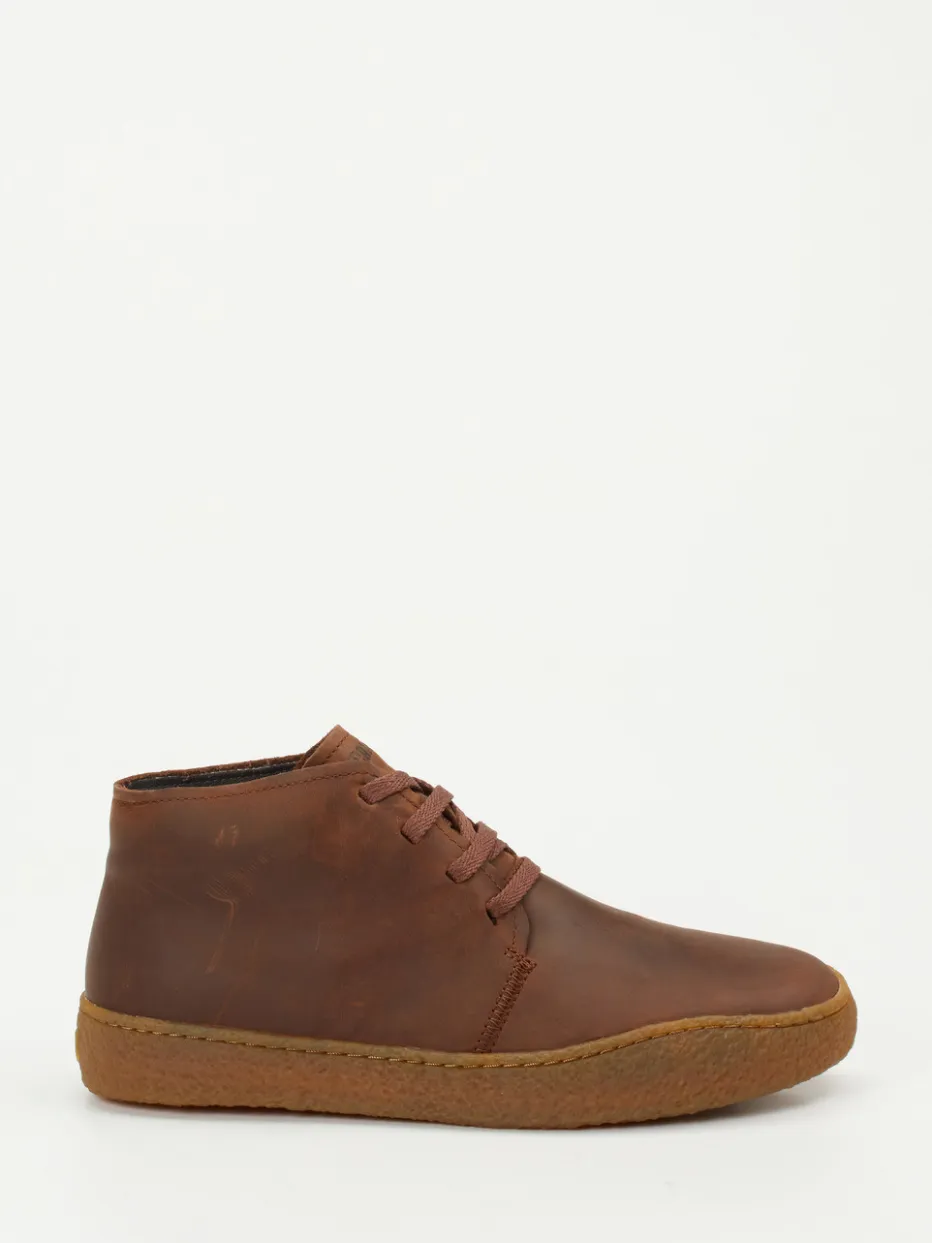 Casual-Komfort mit Workwear-Flair.Camper zeigt hier einen knöchelhohen Herren-Schnürschuh im Desert-Boot-Stil, gefertigt aus braunem Fettleder mit mattem Finish. Ideal für kühle Tage: Der mittelhohe Schaft, die kupferfarbene Vierloch-Schnürung und die rutschhemmend profilierte Gummisohle bieten wind- und wasserabweisende Eigenschaften. Die klare Silhouette, Ton-in-Ton-Nähte und Logoprägungen unterstreichen das minimalistische Design. Ergänzt wird der Tragekomfort durch das atmungsaktive Meshfutter und ein gepolstertes Fußbett. Der warme Naturton passt zu „Quiet Luxury“-Outfits und casualorientierten Styles. Markentypisch ist der gekonnte Mix aus Funktion und zeitloser Reduktion.