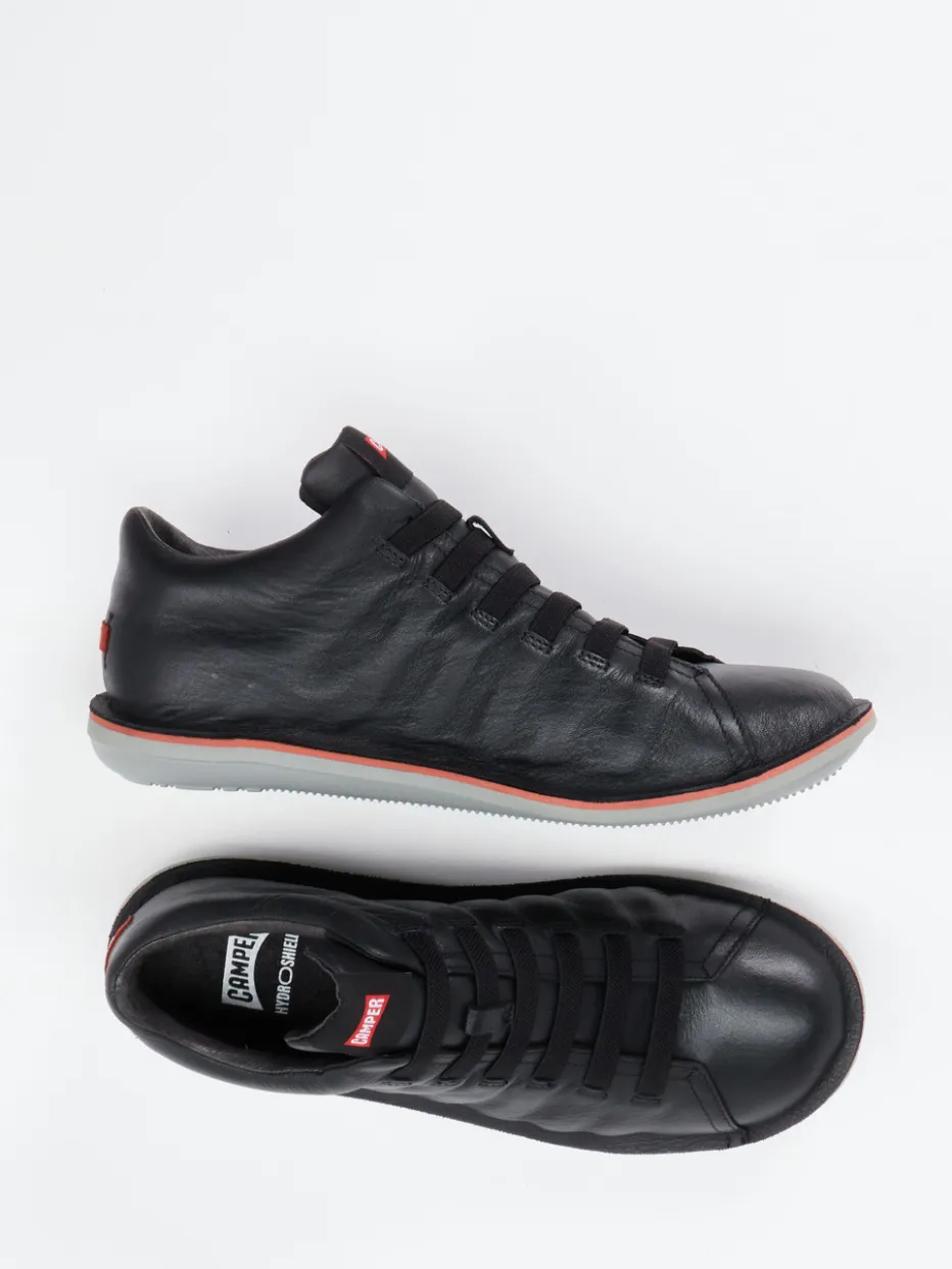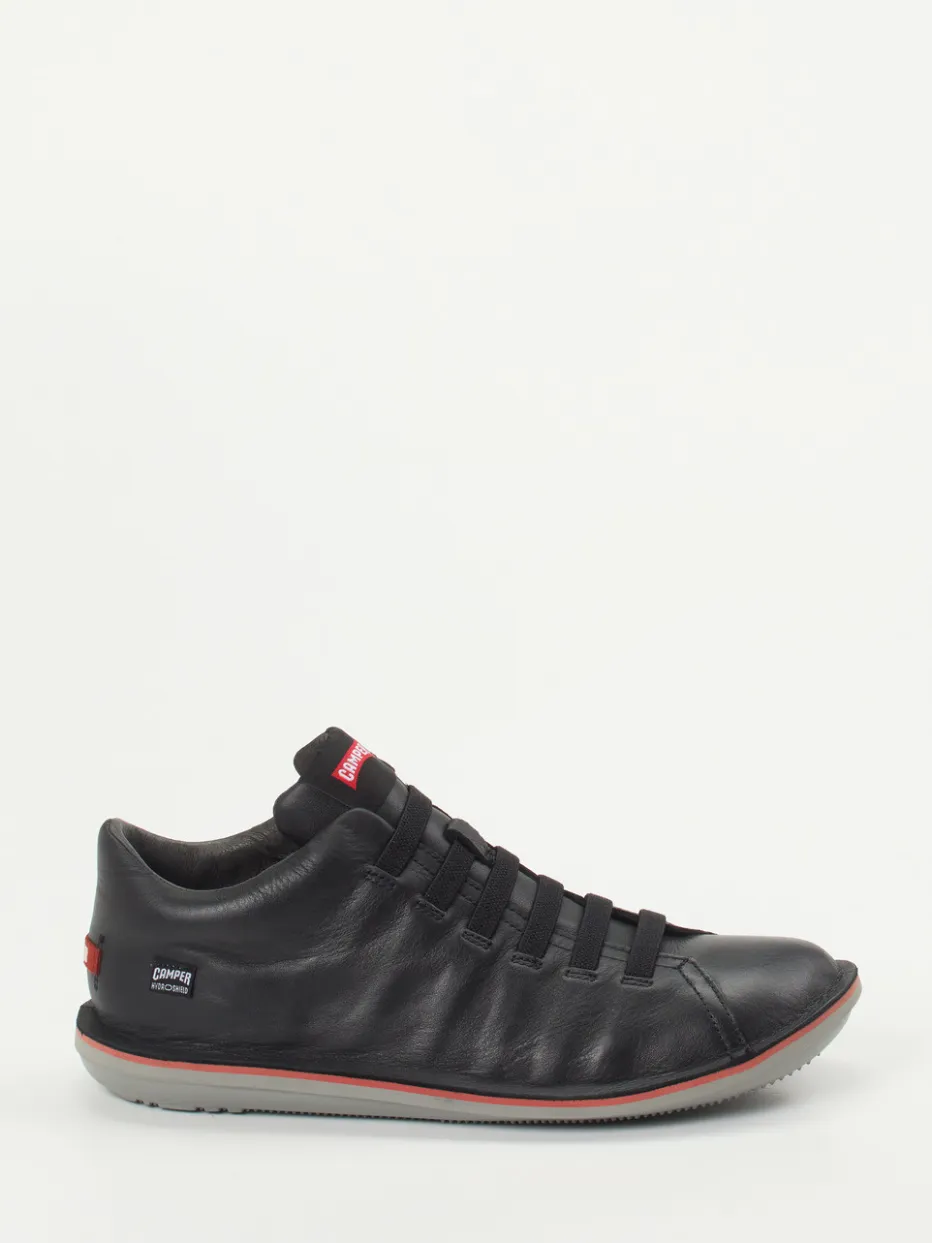 Minimalistischer Komfort für jeden Tag.Camper präsentiert mit diesem Sneaker einen urban ausgerichteten Herren-Low-Top aus schwarzem Kalbleder. Die matte Lederoberfläche zeigt sich wasserabweisend dank HydroShield-Veredelung. Die ergonomisch geformte Gummisohle mit noppenartigem Profil bietet optimale Dämpfung beim Gehen, während sechs elastische Riemen das Anziehen erleichtern und sicheren Halt gewährleisten. Rote Akzente an der Sohle sowie farblich abgestimmte Logos unterstreichen den klaren Streetwear-Look. Innen absorbiert atmungsaktives Textil effektiv Feuchtigkeit – ideal für citytaugliche Bewegungsfreiheit. Kombiniert zu Funktionsjacke und Rucksack wirkt der Look besonders authentisch. Ein durchdachtes Design für komfortbetonte Urbanwear mit markentypischer Innovationskraft.