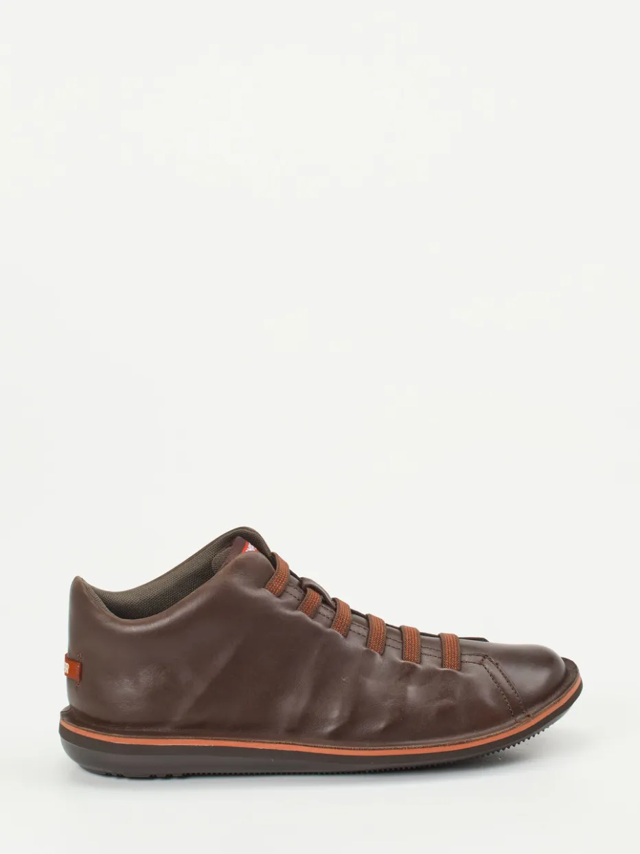 Vielseitiger Komfort für den urbanen Alltag.Camper interpretiert den Sneaker modern und geradlinig. Ideal für entspannte City-Tage oder casual Freizeit-Looks: Das dunkelbraune Kalbleder zeigt sich matt und hochwertig verarbeitet, ergänzt durch rostbraune Elastbänder für flexible Weitenanpassung. Ein gepolstertes Meshfutter sorgt im Inneren für Atmungsaktivität, die ergonomische Gummisohle für griffigen Halt. Die abgerundete Form, tonale Nähte und die farblich abgesetzte Laufsohle unterstreichen die reduzierte Formensprache im Sinne urbaner Komfortästhetik. Lässt sich stilsicher mit geradem Denim oder atmungsaktiver Chino kombinieren. Camper steht hier für durchdachtes Design mit maximaler Bewegungsfreiheit.