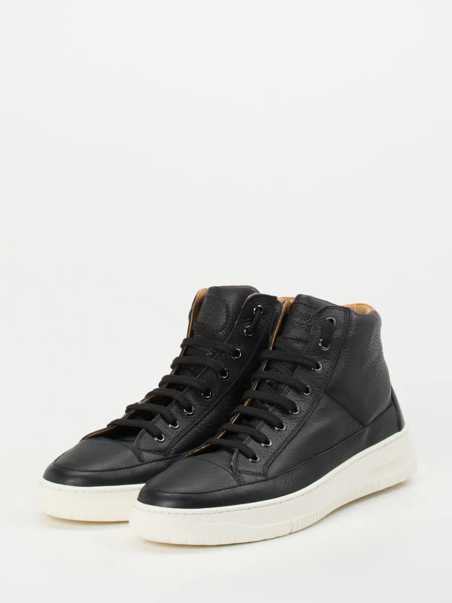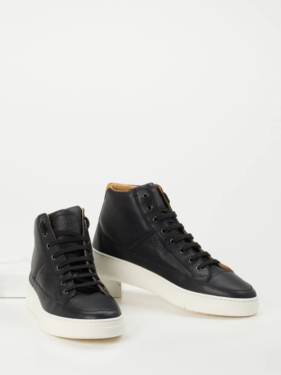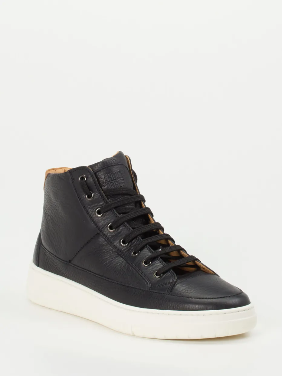 Minimalismus trifft Komfort.Candice Cooper zeigt mit diesem High-Top-Sneaker für Herren ein markentypisch zeitloses Design mit urbanem Twist. Die hochwertige Verarbeitung von genarbtem Kalbleder in tiefem Schwarz überzeugt ebenso wie die kontrastfarbene Fersenkappe in Hellbraun. Eine fein abgestimmte Zick-Zack-Schnürung, dezente Ton-in-Ton-Nähte sowie eine rutschhemmende Profilsohle unterstreichen das minimalistisch-elegante Design. Dank gepolstertem Schaftrand und wechselbarem Fußbett bietet der Schuh angenehmen Komfort für den Alltag oder den smarten Bürolook. Die klassische Silhouette passt ideal zu gedeckter Streetwear oder monochromen Business-Casual-Outfits. Ein hochwertiger Begleiter für stilbetonte Urbanität.