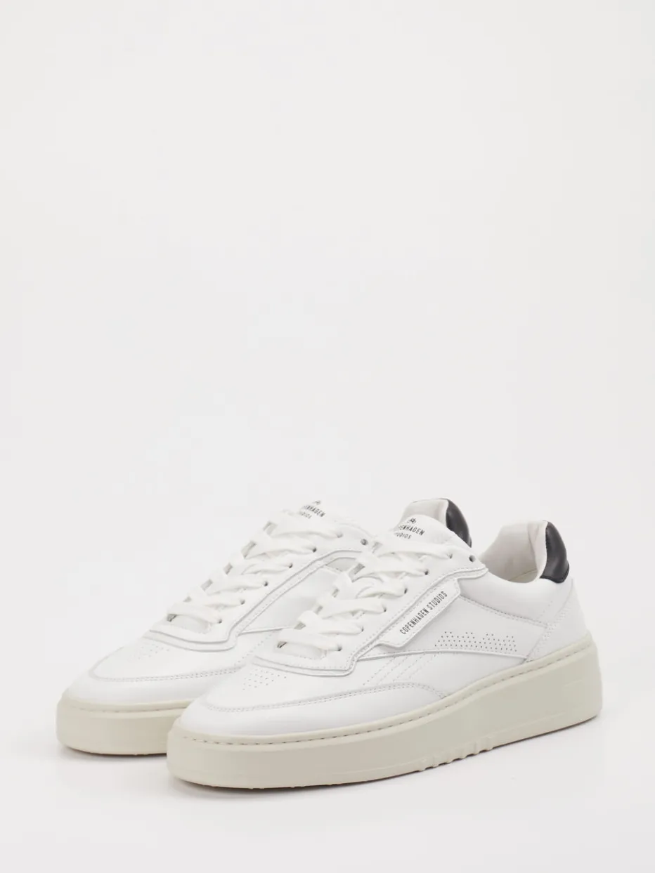 Stilvoller Minimalismus für den Alltag. Copenhagen präsentiert einen hochwertigen Low-Top Sneaker für Damen und Herren. Ob beim Bummel durch die Stadt oder im entspannten Office-Alltag – das Modell aus weißem Kalbleder mit glatter, leicht glänzender Oberfläche bietet vielseitige Kombinationsmöglichkeiten. Der schwarze Fersenbesatz und die perforierten Seitenpartien setzen dezente Akzente, während die erhöhte, off-white Laufsohle aus Gummi Retro-Charme versprüht. Dank textiler Innenausstattung und klassischer Schnürung ist der Tragekomfort ebenso überzeugend wie das stilistisch reduzierte Design. Ein Unisex-Schuh, der sowohl im urbanen Umfeld als auch zu minimalistischen Outfits passt. Copenhagen steht hier für urbanen Komfort mit nordischer Designklarheit.
