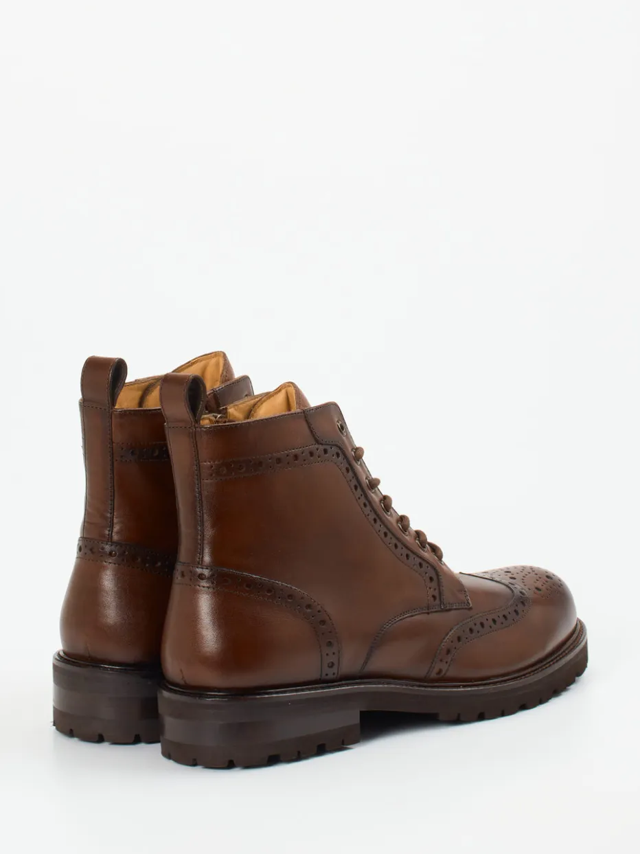 Die Kombination aus kastanienbraunem Kalbleder, traditioneller Brogue-Lochung und moderner Profilsohle verleiht diesen Boots eine elegante Alltagstauglichkeit.