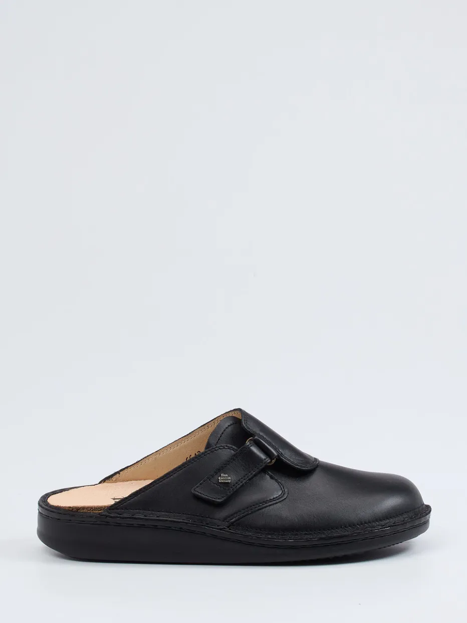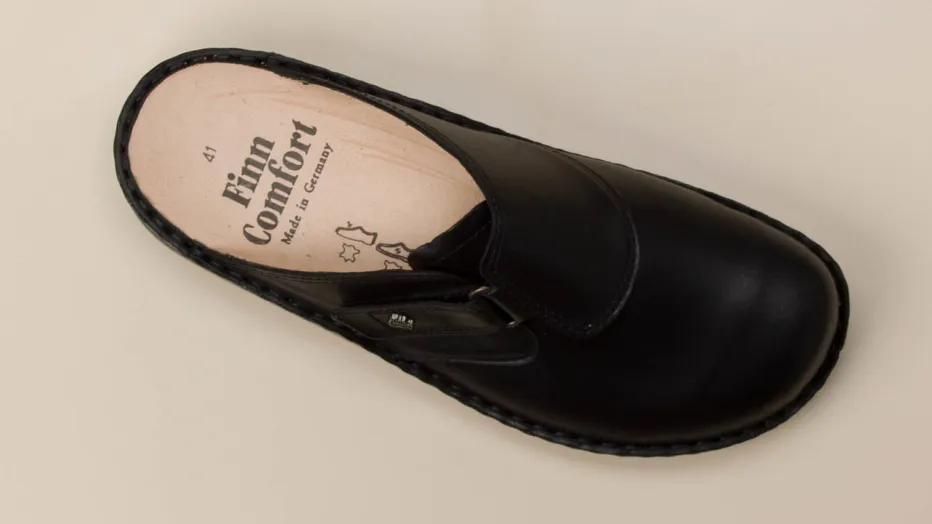 Für entspanntes Gehen zwischen Sofa und Alltag.Finn Comfort präsentiert eine komfortorientierte Pantolette aus der Kategorie Bequemschuhe. Weiches, mattes Kalbleder in edlem Schwarz umschließt den Fuß vorn geschlossen, während der offene Fersenbereich das An- und Ausziehen erleichtert. Die individuell verstellbare Riemenkonstruktion mit Klettverschluss sorgt für optimalen Halt. Innen punktet das Modell mit einem ergonomisch geformten, herausnehmbaren Fußbett mit Lederbezug. Rutschhemmende Gummisohle und dezentes Metalllogo runden das durchdachte Design ab. Ideal für daheim oder entspannte Alltagsszenarien im Comfort-Revival-Stil. Nachhaltige Wertigkeit trifft auf funktionalen Minimalismus – typisch Finn Comfort.