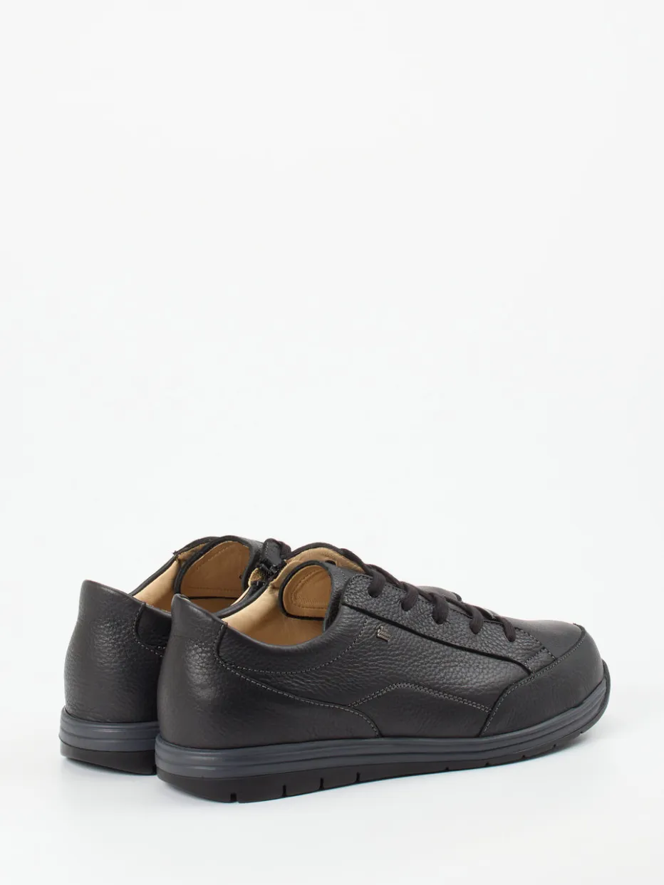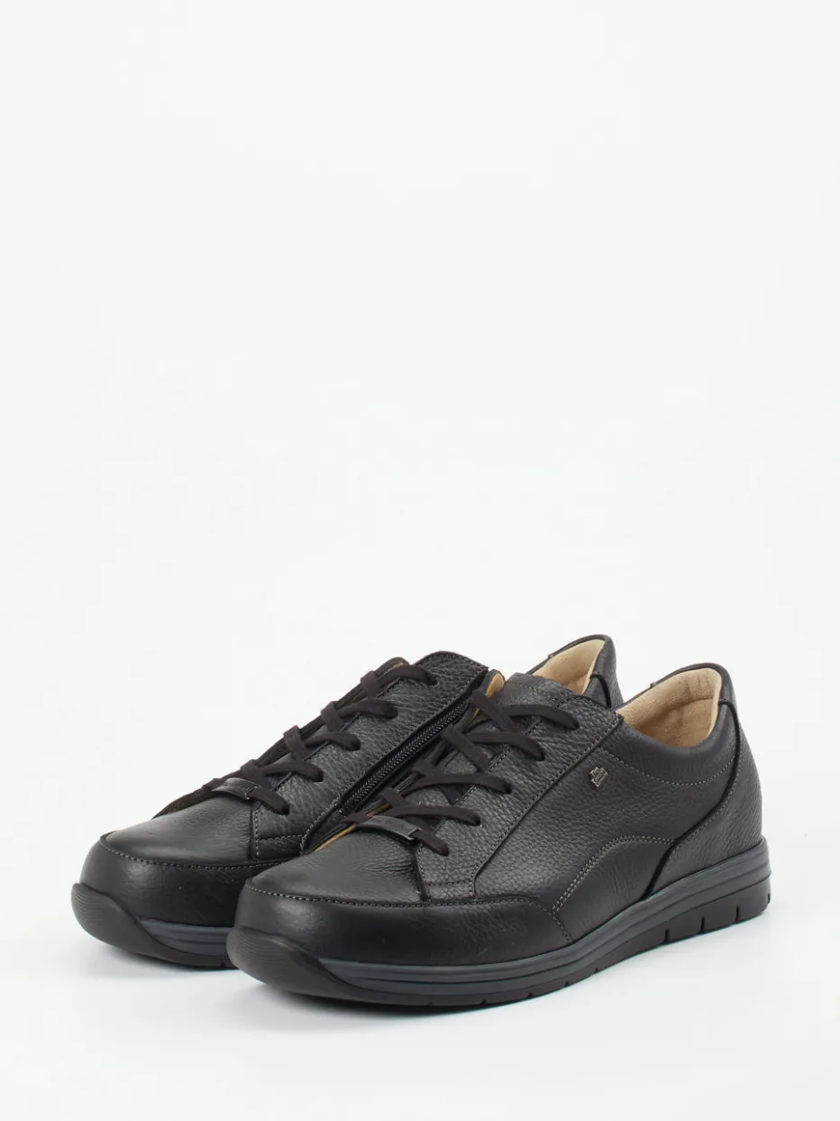 Schwarz trifft auf Komfort.Finn Comfort präsentiert mit diesem Herren-Komfort-Sneaker eine stilvolle Lösung für alltagsorientiertes Gehen. Ob für längere Spaziergänge oder den Start in einen aktiven Tag – das strapazierfähige Kalbleder mit genarbter Oberfläche sorgt für Stabilität und einen edlen Look. In sattem Schwarz gehalten und mit flacher Silhouette wirkt das Modell dezent und modern. Praktische Details wie Schnürung kombiniert mit seitlichem Reißverschluss erhöhen die Alltagstauglichkeit, während eine gedämpfte Gummisohle ergonomisches Gehen spürbar erleichtert. Das textile Innenleben sorgt zusätzlich für angenehmes Fußklima. Der Sneaker passt ideal zu Jeans und gepflegter Freizeitkleidung. Typisch Finn Comfort: maximale Bequemlichkeit mit zurückhaltender Ästhetik.