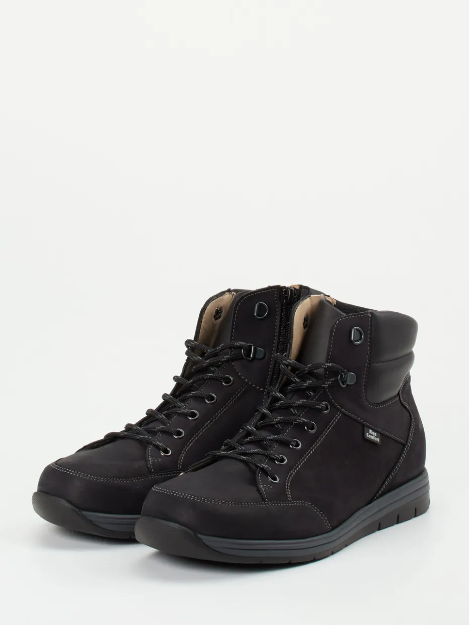 Die Herrenschuhe von Finn Comfort zeigen sich in Form knöchelhoher Stiefeletten aus schwarzem Nubukleder.