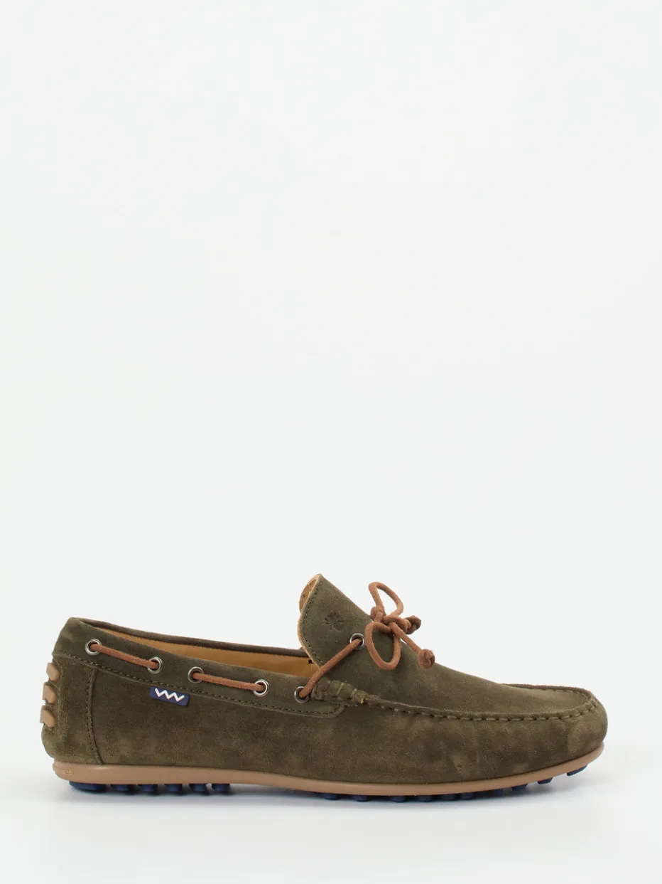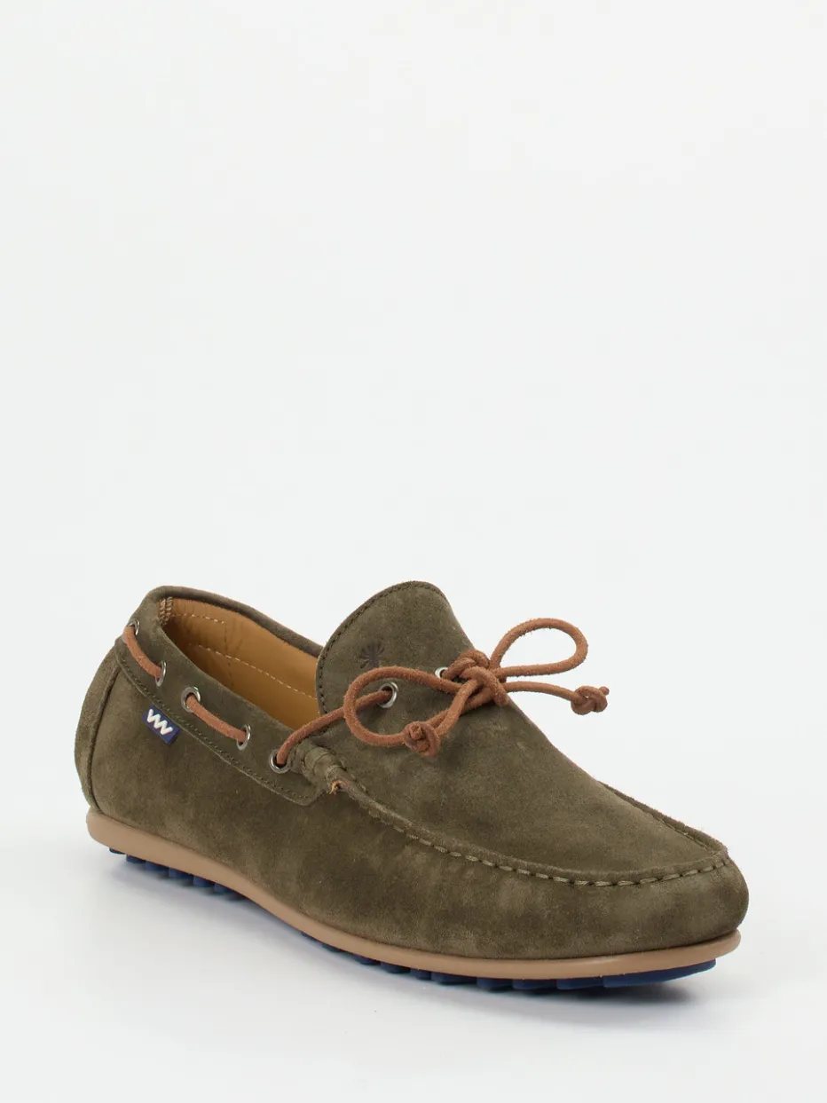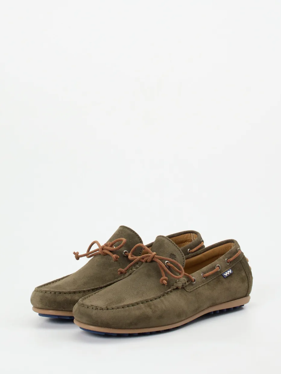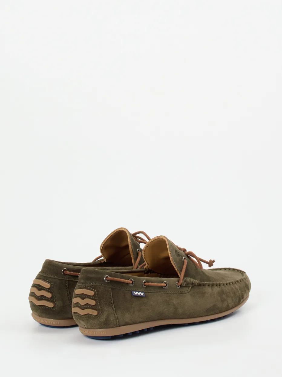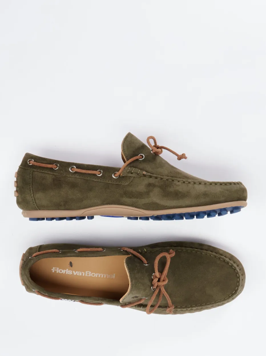 Floris van Bommel präsentiert einen Herren-Mokassin in bewährter Slipper-Form, gefertigt aus moosgrünem Veloursleder.