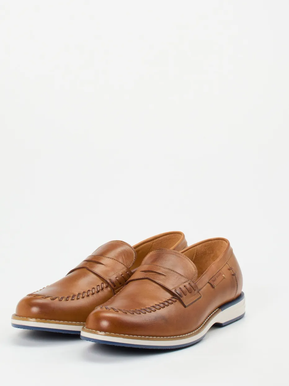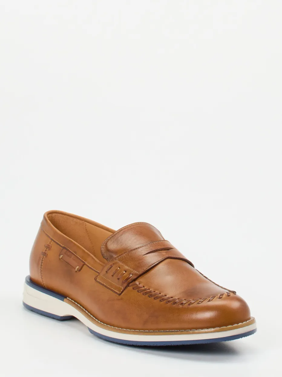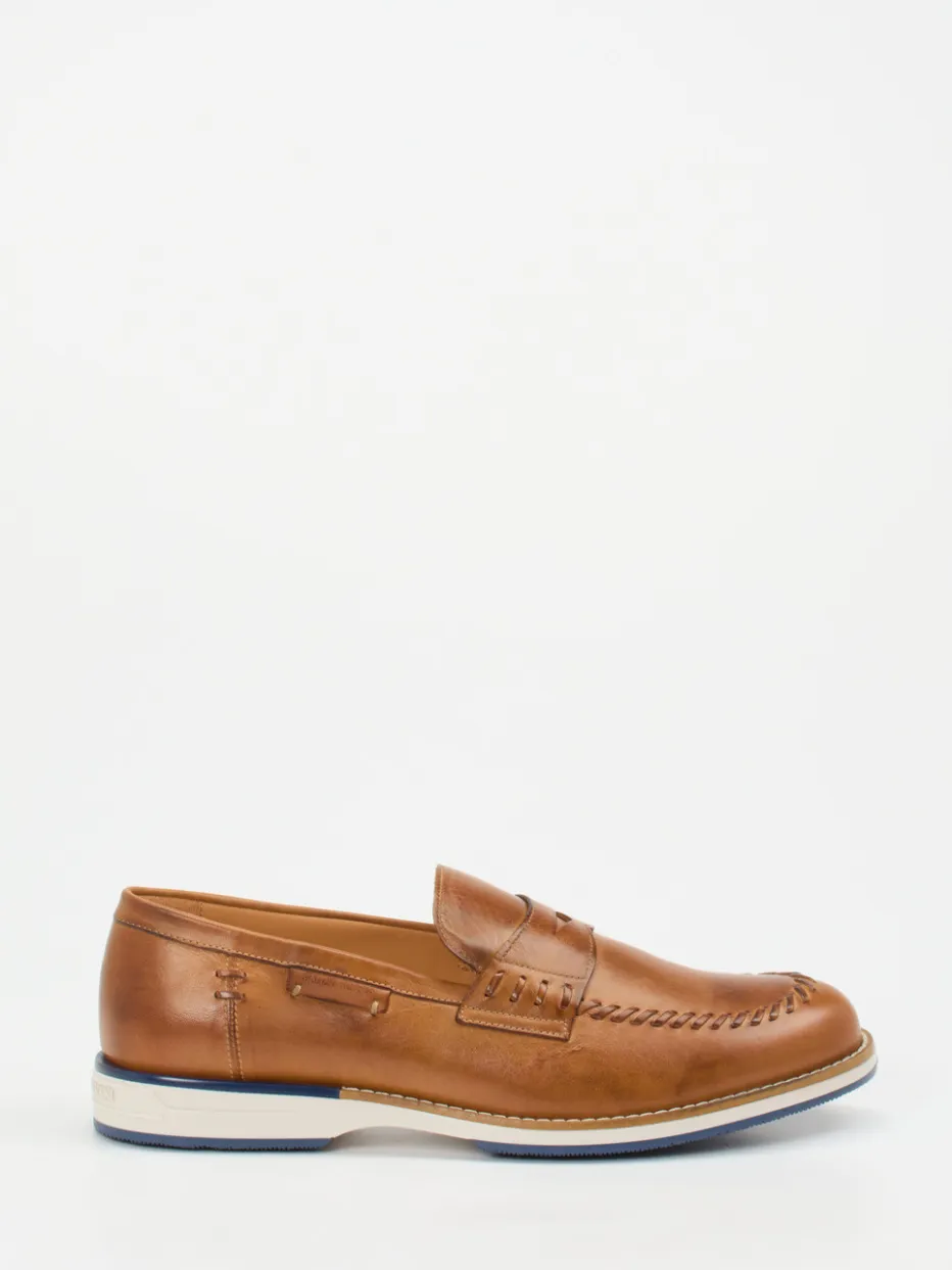 Stilvoll durch den Alltag.Herrenschuh-Kollektion von Galizio Torresi: Dieser Loafer aus cognacbraunem Kalbleder vereint Eleganz und Komfort. Für stilsichere Bürolooks und gehobene Freizeit-Outfits bietet das Modell glänzend verarbeitetes Kalbleder mit sichtbarer Mokassinnaht und klassischem Penny-Steg. Die weiße Gummisohle mit dunkelblauen Akzenten bringt sportliche Dynamik ins Spiel und sorgt gleichzeitig für angenehmen Grip beim Gehen. Die klassische, flache Silhouette und das komfortable Lederfußbett runden das designstarke Gesamtbild ab. Besonders in Kombination mit Chinohose und Ledergürtel entfaltet der Look seine Wirkung. Ein Preppy-inspirierter Sommerhalbschuh mit italienischer Fertigungsqualität.