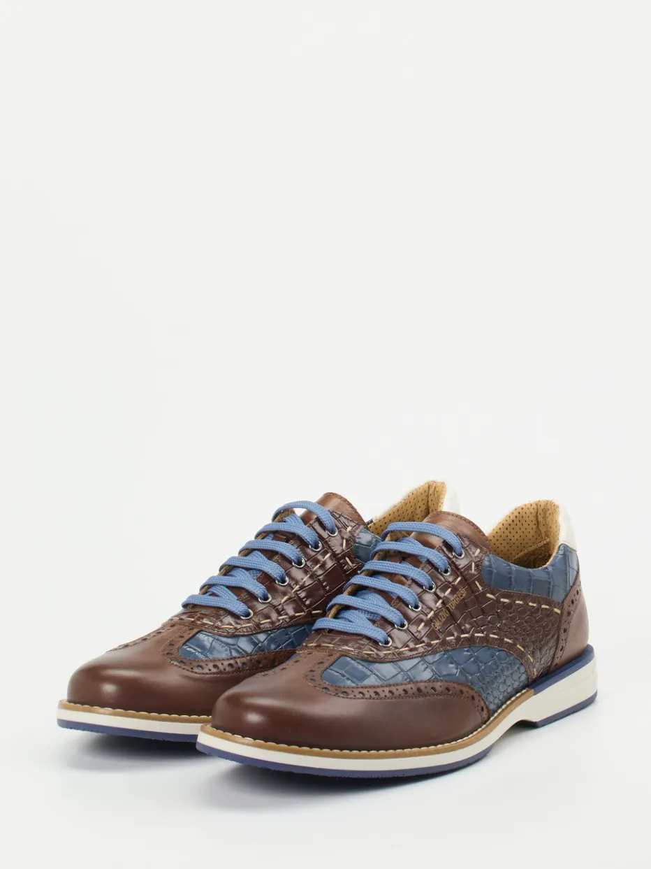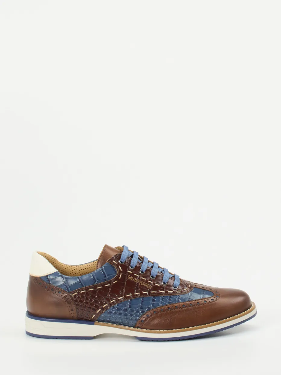 Stilvoller Mix aus Klassik und Moderne.Der Herren-Schnürschuh von Galizio Torresi überzeugt als elegante Fusion aus Derby und Sneaker. Ob beim Citymeeting oder im After-Work-Café – das geprägte Leder in cognacbrauner Reptil-Optik trifft auf glatte, glänzende Partien und sorgt zusammen mit brogue-inspirierten Details sowie Kontrastnähten für visuelle Raffinesse. Die klassische, flache Form wird durch eine sportliche Gummisohle ergänzt, während das ledergefütterte Innere Komfort garantiert. Farbige Akzente in Jeansblau und Offwhite verleihen dem Modell ein modisch-progressives Finish, das sich stilsicher zu Chinos oder technischen Stoffen kombinieren lässt. Exklusives Design mit Italo-Charakter und präziser Markenfertigung.