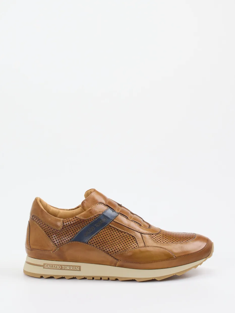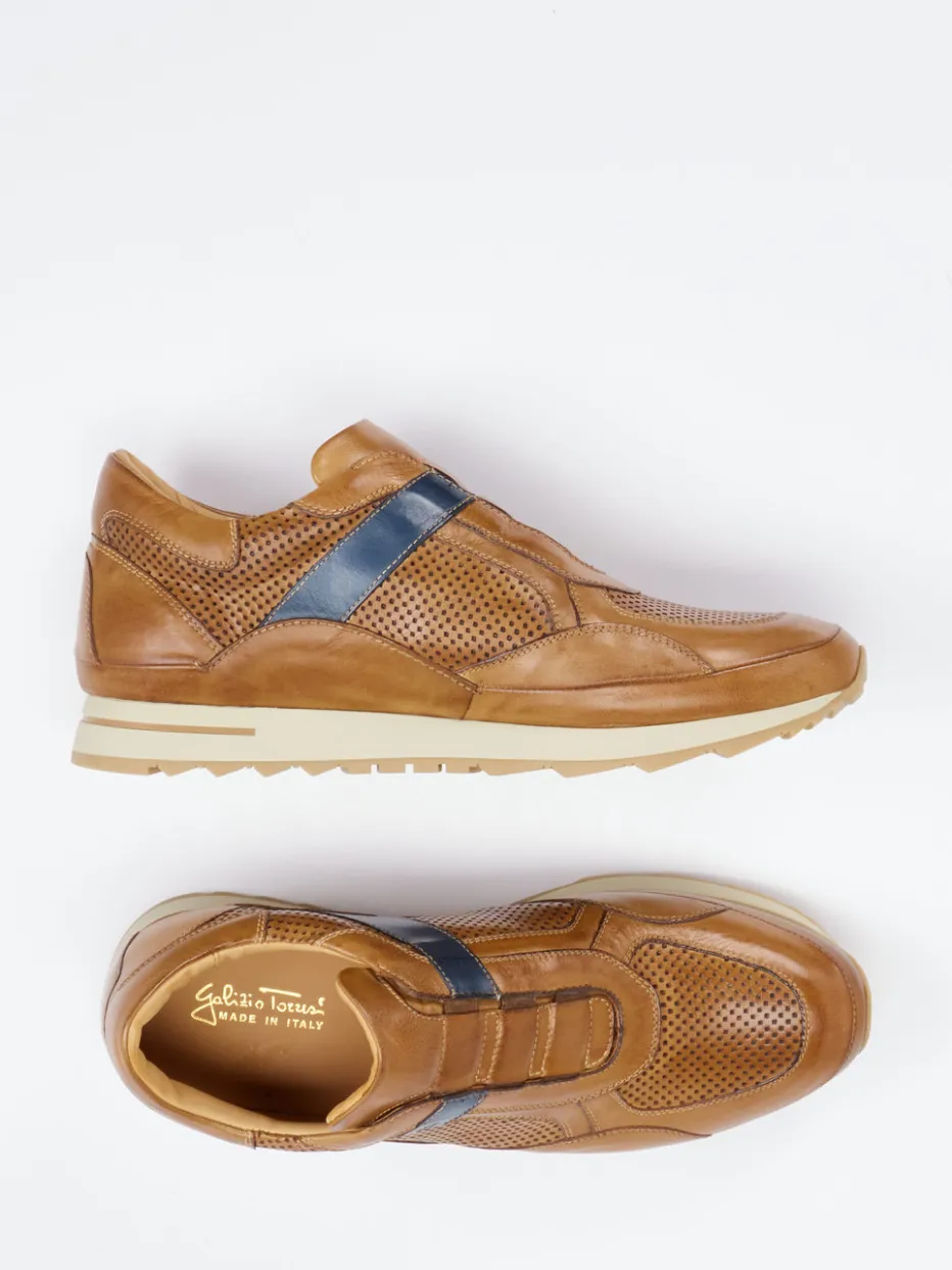 Eleganz trifft sportlichen Komfort.Galizio Torresi präsentiert einen Slip-On Sneaker für Herren, der italienisches Design und praktischen Stil vereint. Für Tage mit langen Wegen und wechselnden Anforderungen bietet dieser cognacbraune Sneaker aus glänzendem, perforiertem Kalbleder maximale Bequemlichkeit. Die elastische Einstiegshilfe sorgt für einen schnellen Einstieg, während der gepolsterte Schaft und das herausnehmbare Fußbett Tragekomfort garantieren. Farbliche Akzente in Dunkelblau, ein edler Kontraststreifen mit Logo-Prägung sowie die abgerundete Silhouette unterstreichen den modischen Anspruch. Die profilierte Gummisohle bietet dabei sicheren Halt. Ein Stilfavorit für Individualisten mit Liebe zu Komfort, Materialqualität und italienischer Formensprache.