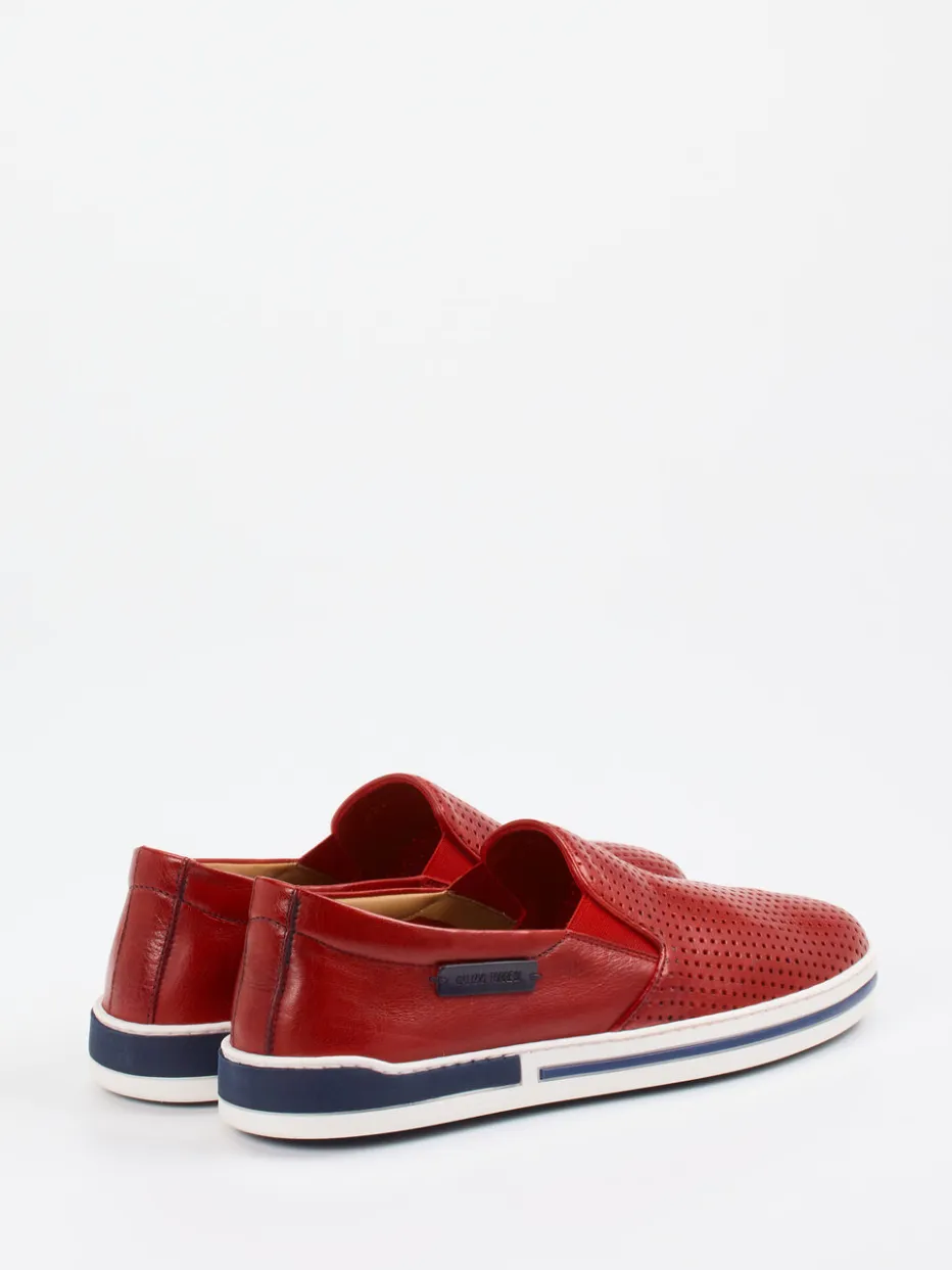 Sommerlicher Komfort mit italienischer Leichtigkeit.Galizio Torresi präsentiert einen Herren-Slipper, der urbanen Stil und luftige Funktionalität perfekt vereint. Wenn es warm wird, sorgt perforiertes, geprägtes Leder in Ziegelrot für angenehme Belüftung ohne Stilverlust. Die glänzende Oberfläche, kombiniert mit einer klassisch flachen Silhouette und elastischen Einsätzen, ermöglicht bequemes Hineinschlüpfen. Eine auffällig zweifarbige Gummisohle in Weiß und Marineblau setzt sportliche Akzente, während ein dezentes Seitenlogo das Design abrundet. Die quiet-luxury-inspirierte Farbgebung und die durchdachte Verarbeitung machen ihn ideal für Freizeit, Urlaub oder entspannte City-Looks. Galizio Torresi steht für kompromisslose Verarbeitung und mediterranen Stil – auch an heißen Tagen.