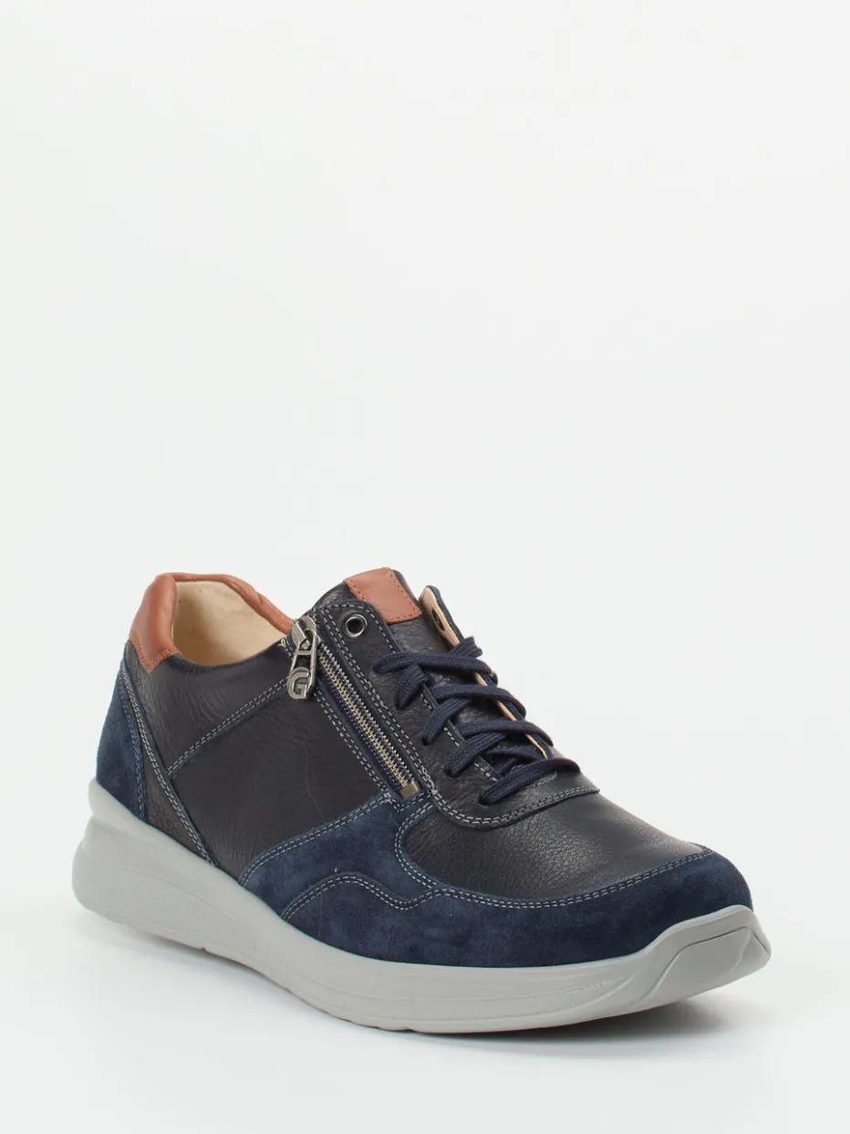 Stilvoll bequem durch den Alltag.Ganter präsentiert mit diesem Herren-Komfort-Sneaker eine alltagserprobte Lösung im Segment der Bequemschuhe. Ob auf dem Weg zur Arbeit oder beim Stadtbummel – das Kombination aus dunkelblauem Kalbleder und samtig angeschliffenem Nubuk verleiht dem Schuh eine sportlich-elegante Optik. Der praktische seitliche Reißverschluss ergänzt die Schnürung und ermöglicht ein komfortables An- und Ausziehen. Cognacbraune Kontrastnähte und silberfarbene Details setzen dezente Akzente. Die extraleichte Gummisohle und der gepolsterte Schaftrand steigern den Tragekomfort und machen ihn ideal für entspannte Freizeitlooks. Der Look orientiert sich an zeitgenössischem Minimalismus mit einem Hauch Streetwear. Das herausnehmbare, lederbezogene Korkfußbett unterstreicht Ganter-typischen Komfort und Qualität.