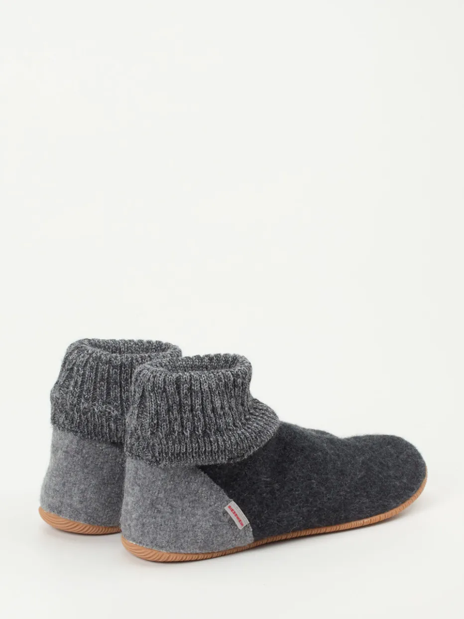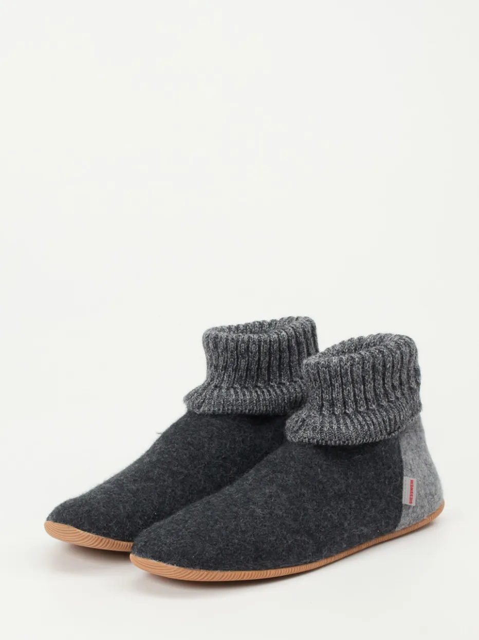 Wenn die Temperaturen sinken, bieten diese Hüttenschuhe wohltuende Wärme und perfekten Sitz. Der anthrazitgraue Wollfilz mit samtiger Oberfläche verleiht dem Modell ein beruhigend-homogenes Erscheinungsbild, ergänzt durch hellgraue Strickbündchen und eine beigebraune Kontrastferse. Die flexible Gummisohle sorgt für rutschhemmenden Tritt auf glatten Böden. Inspiriert vom skandinavischen Loungewear-Stil passen sie hervorragend in moderne Cozy-Living-Konzepte. Harmoniert stilvoll mit Fleece-Loungewear in Naturtönen.