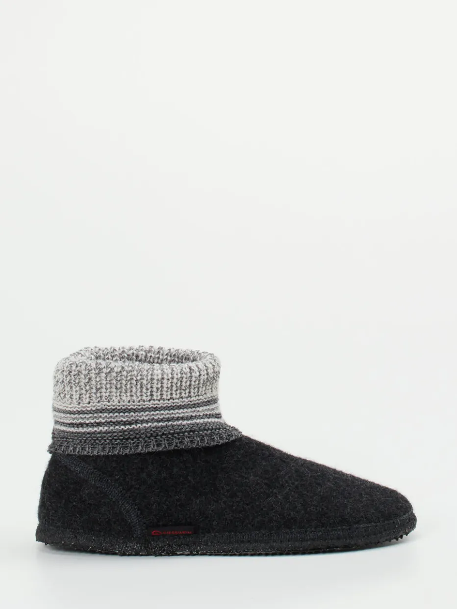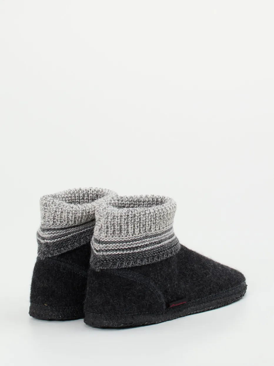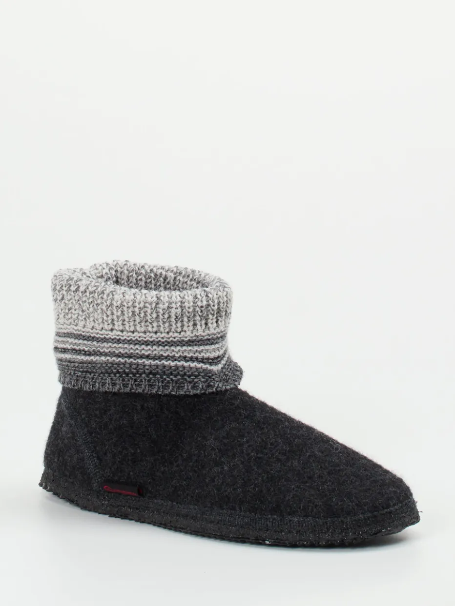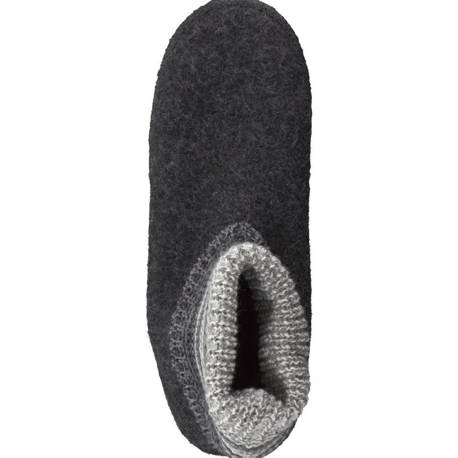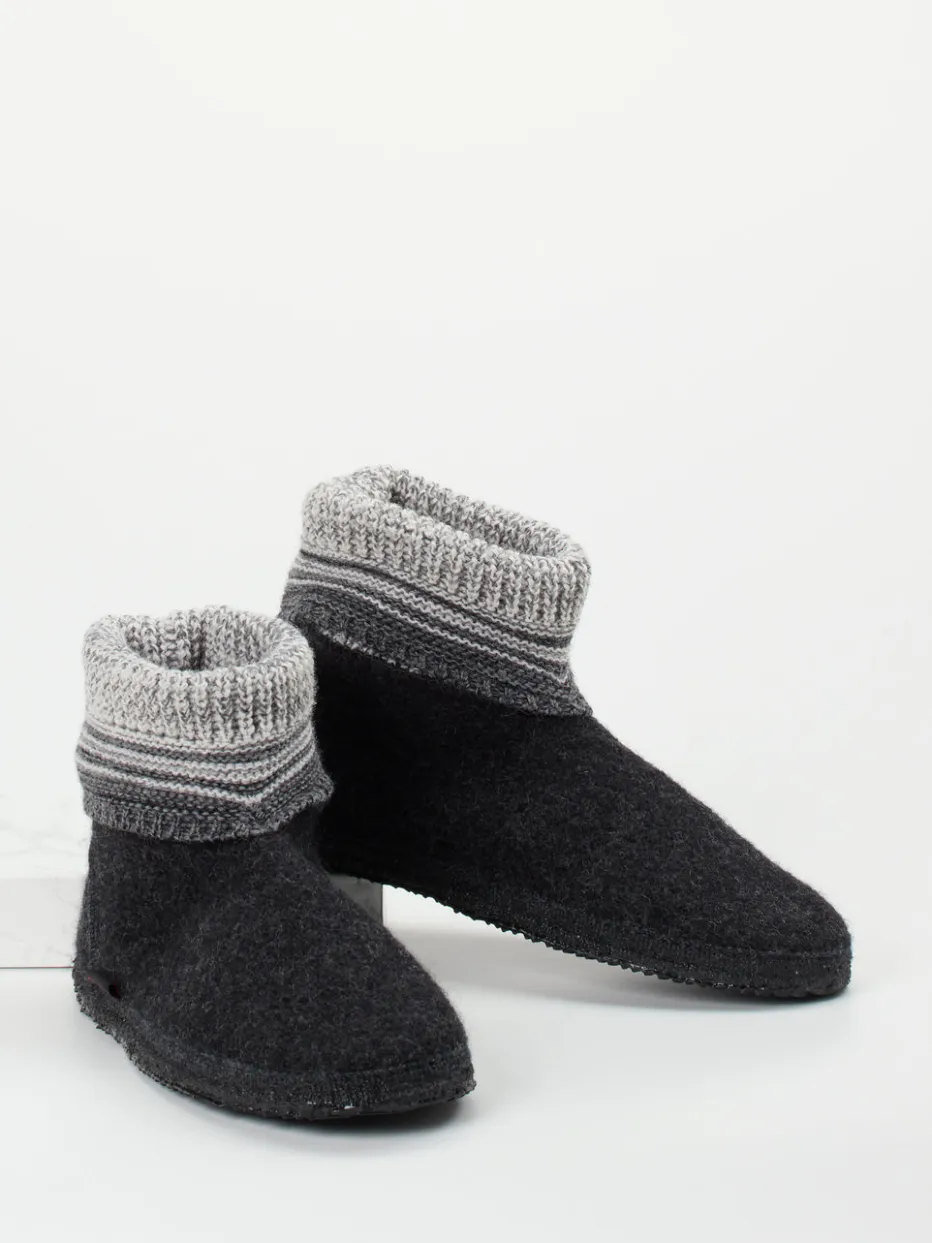 Ideal für kalte Winterabende punktet dieser knöchelhohe Hausschuh mit seinem Obermaterial aus anthrazitfarbenem, filzigem Wollfilz. Ein elastisches Strickbündchen in Grau mit Streifenstruktur sorgt für komfortablen Halt und verleiht dem Design einen nordischen Akzent. Die Gummisohle ist rutschhemmend strukturiert und sorgt für Trittsicherheit auf glatten Böden. Inspiriert von Scandi Comfort und Cocooning-Trends bringt das Modell Natürlichkeit und Wärme ins Zuhause. Perfekt kombinierbar mit Fleece-Loungewear oder Kuschelsocken.