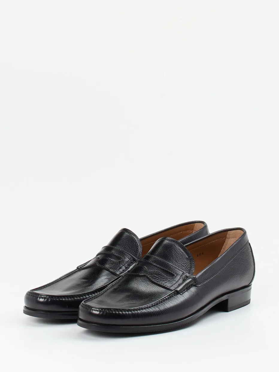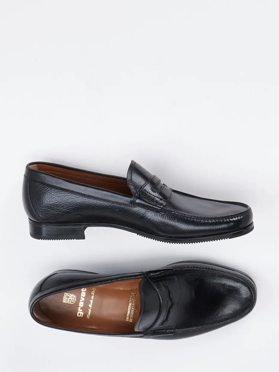 Vollendete Form für klassische Looks.Gravati präsentiert mit diesem Herren-Loafer ein Meisterstück traditioneller Schuhmacherkunst. Wenn bei Geschäftsterminen oder eleganten Freizeitaktivitäten Zuverlässigkeit und Stil gefragt sind, punktet dieser Loafer auf ganzer Linie. Das schwarze Kalbleder mit feiner Prägung und glänzend genarbter Oberfläche verleiht dem Modell Charakter und Tiefe. Die klassische, schmale Form mit Penny-Steg und Mokassinnaht unterstreicht den Heritage-Stil ebenso wie die Ton-in-Ton-Nähte. Als Schlupfschuh mit weichem Lederfutter und profilierter Gummisohle bietet er Komfort und sicheren Tritt. Ideal zu Anzughose oder Wollchino. Ein Statement für Understatement und Qualität – typisch Gravati.
