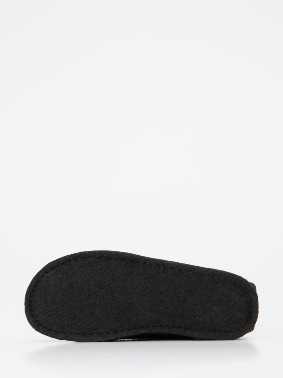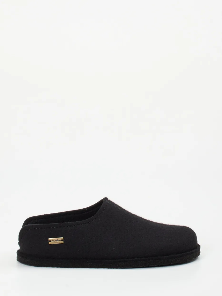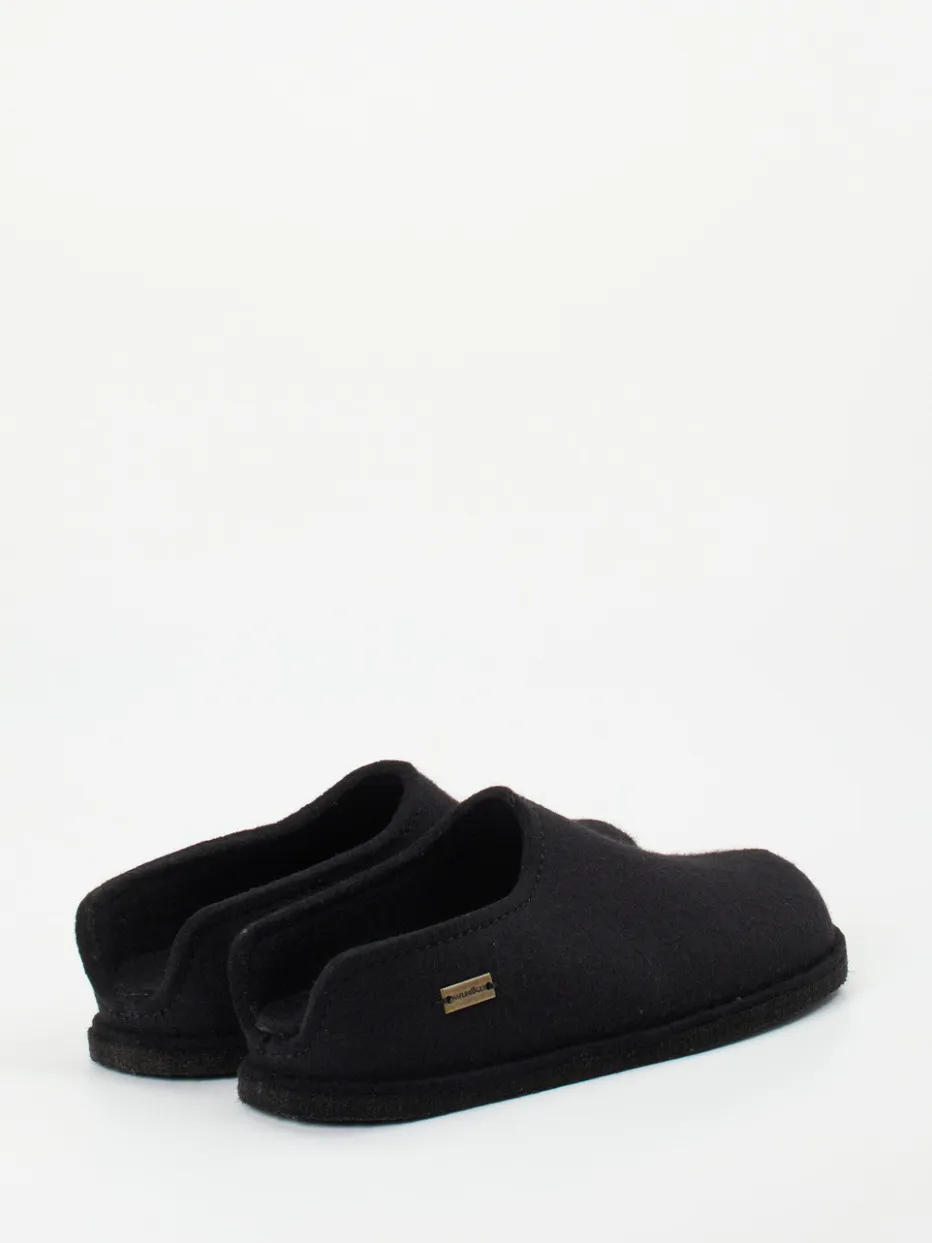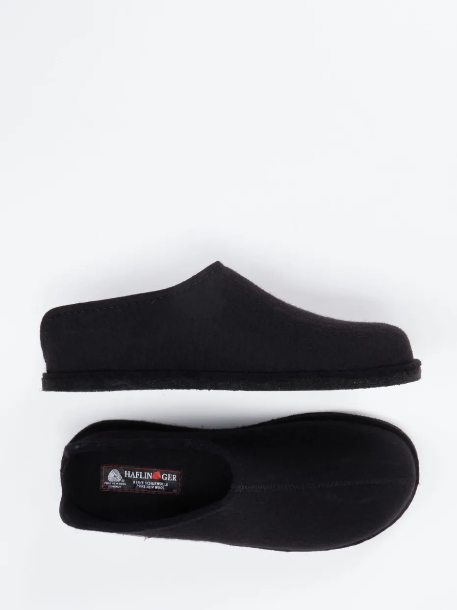 Minimalismus trifft auf natürlichen Komfort.Haflinger präsentiert mit diesen Hüttenschuhen eine wohltuend schlichte Lösung für entspannte Wohnmomente. Der Hausschuh richtet sich an alle, die Wärme und Halt bei gleichzeitigem Komfort suchen. Das Modell besteht aus 100 % gewalkter Schurwolle mit matter Oberfläche und bietet durch die geschlossene, leicht hochgezogene Form optimalen Sitz. In tiefem Schwarz gehalten und mit einem dezenten Metall-Logo seitlich verziert, wirkt er zurückgenommen und stilvoll zugleich. Die gummierte Laufsohle ergänzt den wohnlichen Look mit praktischer Rutschfestigkeit. Inspiriert von Loungewear und dem Trend „Quiet Luxury“. Natürliche Materialien und klare Linien ergeben einen unaufdringlich edlen Wohlfühlschuh.