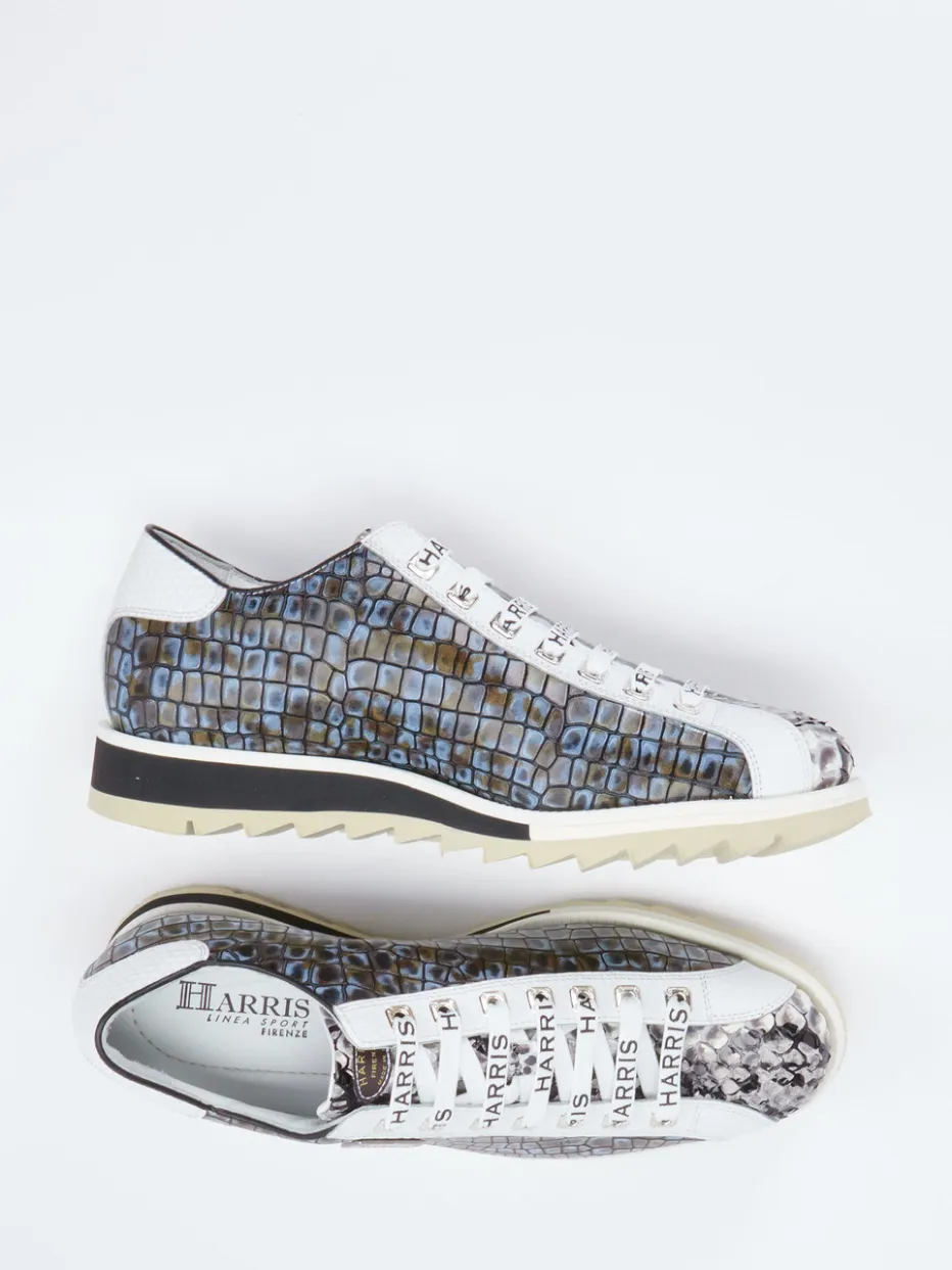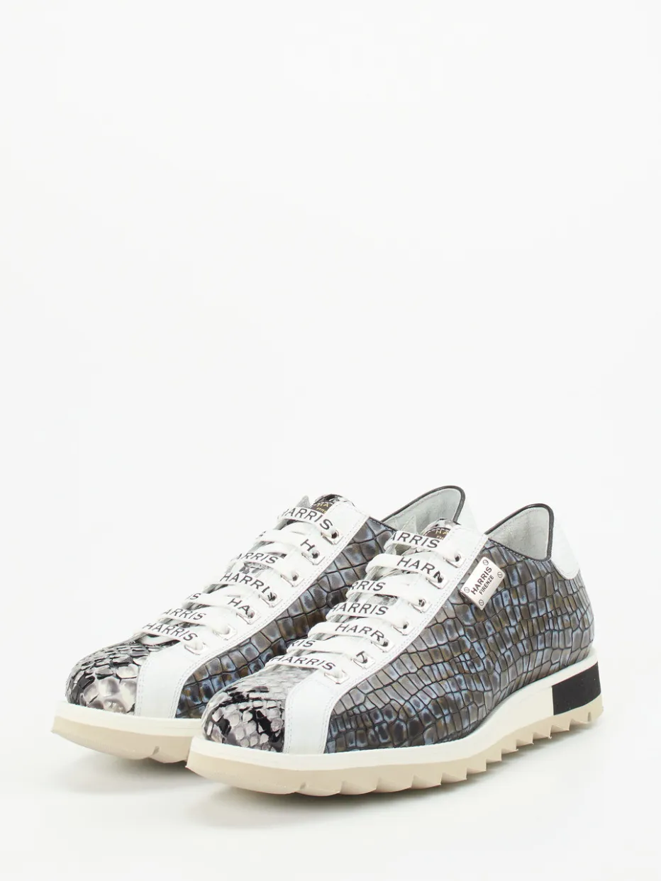 Luxus-Statement in Kroko-Optik.Harris bringt mit diesem Herren-Sneaker eine markante Silhouette auf die Straße. Ideal für stylische City-Trips oder abendliche Ausgänge ist das Modell aus geprägtem Leder mit glänzender Oberfläche gefertigt. Der schiefergraue Grundton, akzentuiert durch weiße Besätze und kontrastreiche Logo-Schnürung, erzeugt ein ausdrucksstarkes Gesamtbild. Die gepolsterte Innensohle sorgt für hohen Komfort, während die kräftige Gummisohle mit Profil festen Grip bietet. Inspiriert von Streetwear und Luxus-Sportswear passt der Schuh ideal zu Designer-Jeans oder Lederjacken. Harris steht hier für exquisiten Materialeinsatz und modische Souveränität.