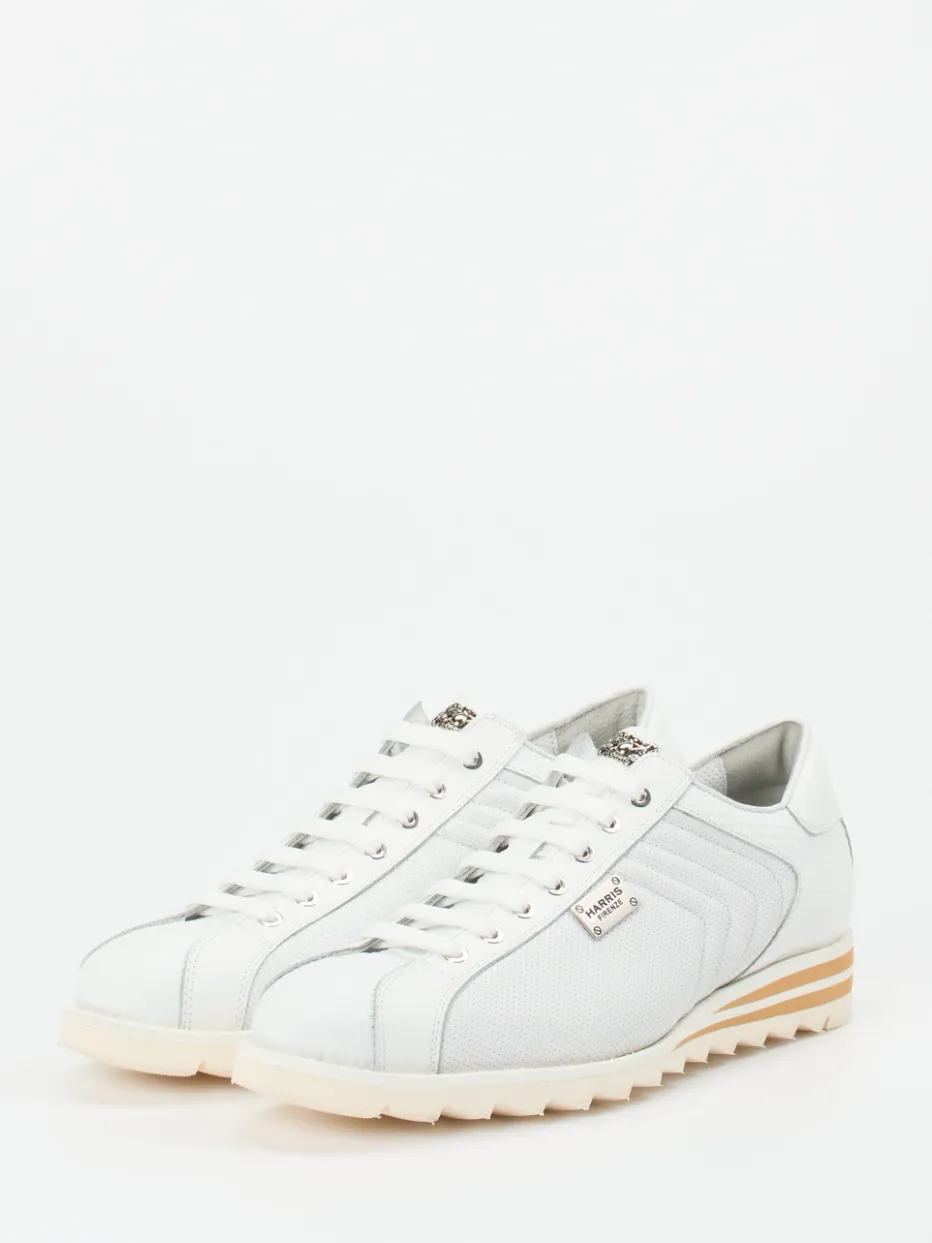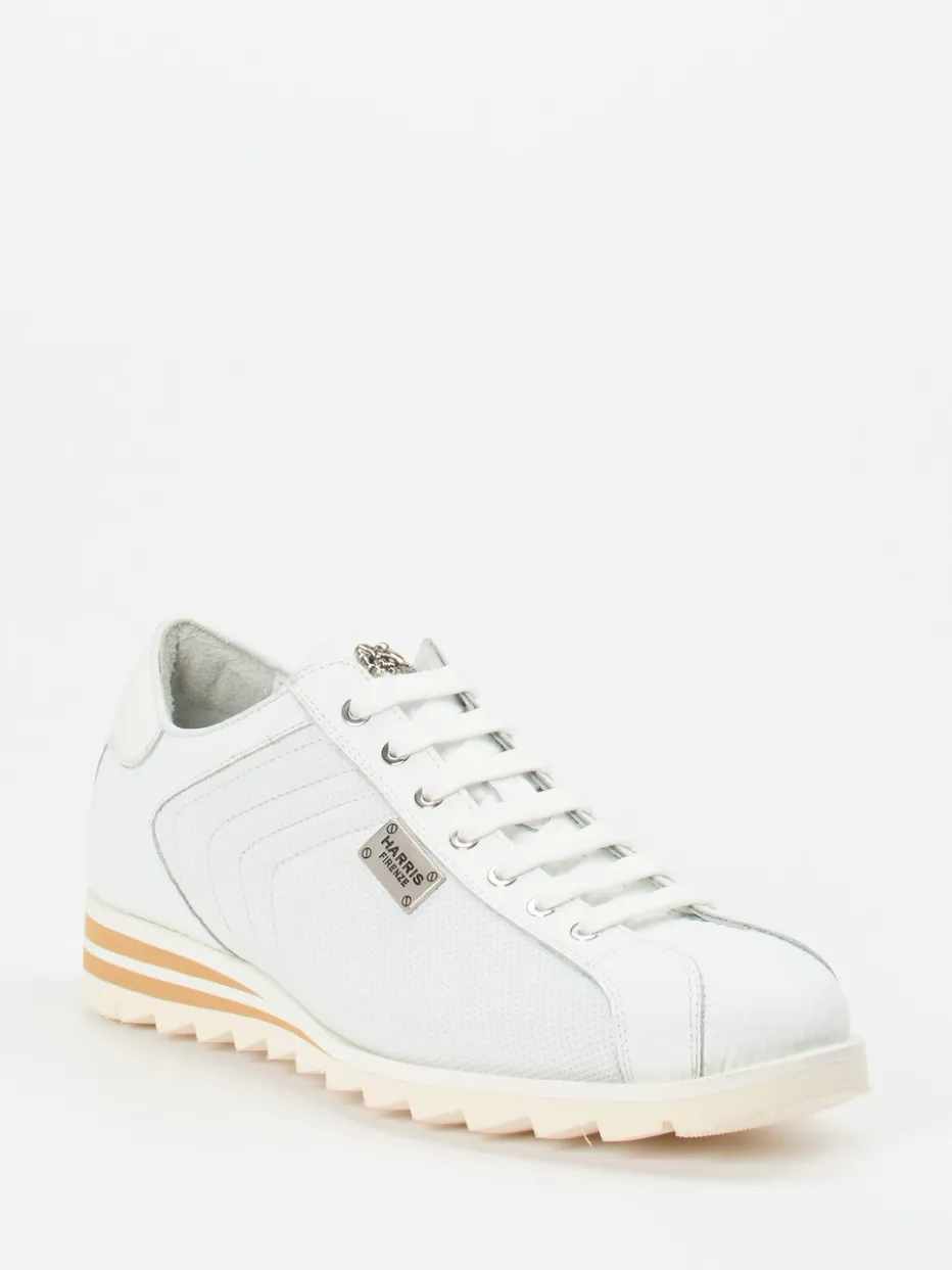 Stilkontrast mit Struktur.Dieser Herren-Sneaker von Harris verbindet klassische Eleganz mit sportlicher Formsprache. Wer im Alltag wie im Büro ein stilsicheres Statement setzen möchte, trifft mit diesem Modell eine durchdachte Wahl. Das Obermaterial aus hochwertigem, geprägtem Kalbleder wird durch Mesh-Einsätze mit dezenter Narbung ergänzt. Weiß dominiert das klare Design, während Sand- und Beigetöne subtile Kontraste über Schnürsenkel, Metallösen und eine zweifarbige Gummisohle mit Retro-Streifendetails setzen. Die flache, formstabile Silhouette mit Haifischprofil unterstreicht die Retro Runner-Ästhetik – ideal für minimalistische Looks mit weißer Chino oder sommerlicher Jacke. Komfort und Präzision in exklusivem Materialmix – typisch Harris.