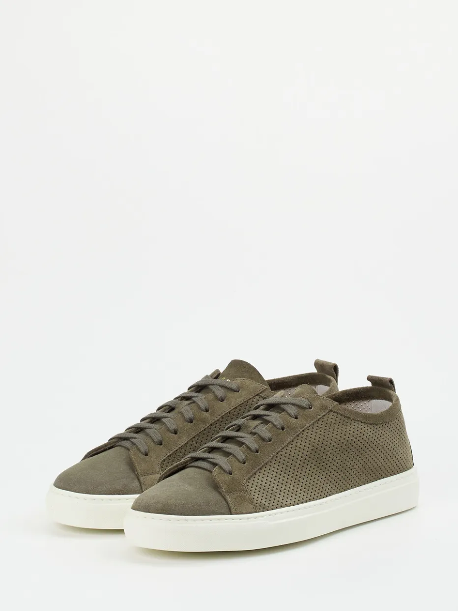 Minimalistische Raffinesse für urbane Looks.Henderson interpretiert den klassischen Herren-Sneaker neu – mit olivgrünem Veloursleder in perforierter Ausführung und einer cleanen, weißen Gummisohle. Ideal für Büro oder Freizeit, bietet das Modell luftig strukturiertes Leder mit matter Oberfläche und goldfarbenem Logodetail an der Ferse. Die flache Silhouette mit Schnürung und Zuglasche passt perfekt zu Chinohosen und monochromen Outfits. Streetwear-Einflüsse vereinen sich mit reduziertem Design zur zeitlosen „Quiet Luxury“-Anmutung. Mit herausnehmbarem Fußbett und rutschhemmender Sohle überzeugt dieser Sneaker durch Komfort und Understatement.
