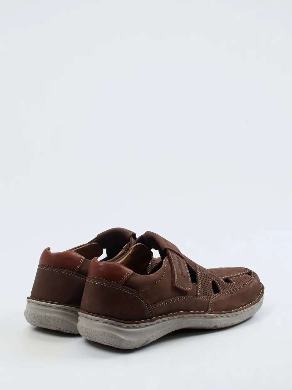 Komfort trifft Luftigkeit.Der Herrenschuh von Josef Seibel verbindet sommerliche Funktionalität mit bequemer Passform. Als Klettslipper konzipiert, eignet er sich besonders für Alltag und Freizeit. Das mittelbraune Nubukleder ist samtig angeschliffen und wirkt durch die Cut-Outs angenehm luftig. Ergänzt wird das Material durch atmungsaktive Mesh-Zonen sowie markante Kontrastnähte. Ein praktischer Klettverschluss ermöglicht individuelle Anpassung, während die weiche Gummisohle mit Profil besten Halt bietet. Der Slipper in Extra-Weite K bietet viel Raum – besonders für breite Füße ein Plus. Im Trend liegt er mit seinem Casual-Komfort und dem Retro-Walking-Look. Ein bequemer Sommerbegleiter mit funktionalem Stilbewusstsein.