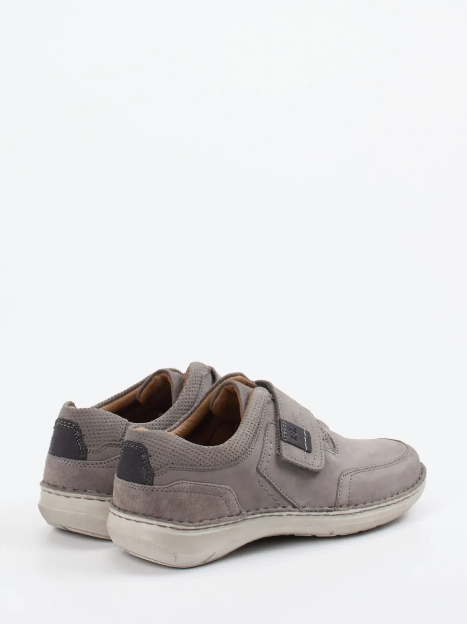 Schuhkomfort für entspannte Tage.Josef Seibel zeigt mit diesem Herren-Klettslipper eine gelungene Verbindung aus Bequemlichkeit und zurückhaltendem Design. Ideal für den Alltag: Das Modell aus grauem Nubukleder überzeugt mit matt strukturierter Oberfläche und weicher Polsterung am Schaftrand. Die rundliche Form sowie der praktische Klettverschluss erleichtern das An- und Ausziehen, während die profilierte Gummisohle rutschhemmenden Halt bietet. Dezente Ton-in-Ton-Nähte und eine kleine Logoprägung am Riemen runden den minimalistischen Look ab. Inspirierend für Casualwear, harmoniert besonders gut mit Stretch-Jeans und Poloshirts. Ein funktionaler Begleiter mit Komfortprofil – für alltagstaugliche Leichtigkeit im Gehen.