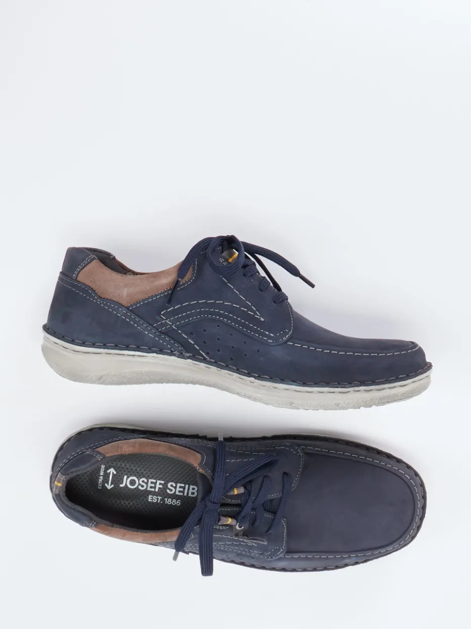 Alltag neu erleben – mit Stil und Komfort.Josef Seibel präsentiert einen Herren-Komfortschuh der Kategorie Schnürhalbschuhe. Wenn entspanntes Gehen im Alltag Priorität hat, überzeugt dieser Halbschuh durch seine großzügige Passform und das soft angeschliffene Nubukleder in Dunkelblau. Kontrastnähte, Veloursakzente an der Ferse und die rund geformte Silhouette unterstützen den lässigen Charakter. Die griffige Gummiprofilsohle sorgt für festen Tritt, während der gepolsterte Einstieg den Fuß sanft umschließt. Ideal für casual-orientierte Looks mit Jeans oder Chinos. Verlässlicher Komfort von Josef Seibel für einen souveränen Freizeitauftritt.
