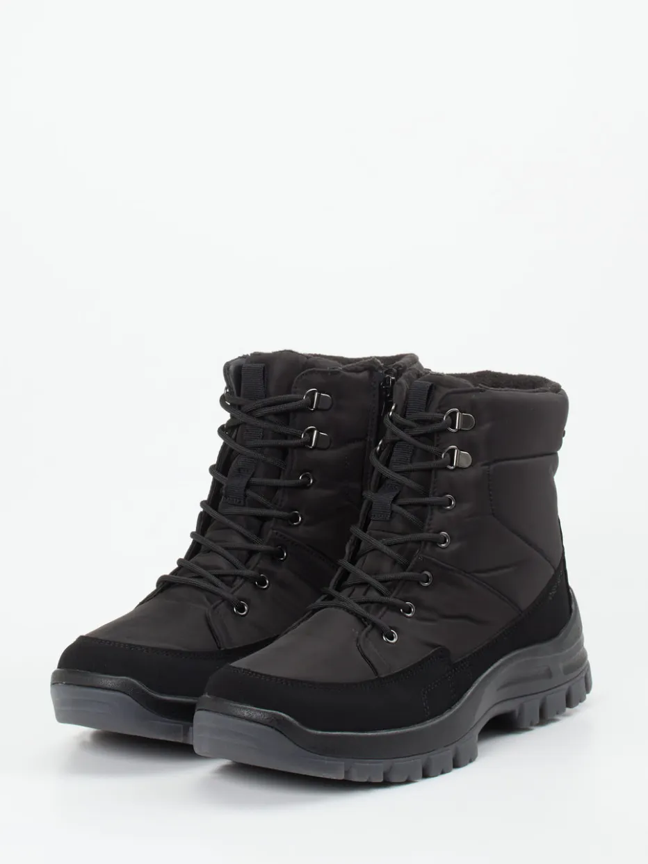 Wetterfest durch den Winter.Josef Seibel präsentiert mit diesem Outdoor-Boot ein funktionales Herrenmodell für Herbst und Winter. Wer bei Schmuddelwetter warme Füße und sicheren Halt sucht, setzt auf diesen knöchelhohen Schnürstiefel mit seitlichem Reißverschluss. Das wasserabweisende Textilmaterial mit matter Oberfläche wird durch eine TopDryTEX-Membran ergänzt, die optimalen Nässeschutz bietet. In klassischem Schwarz gehalten, harmoniert der Look mit silberfarbenen Metallösen, Ton-in-Ton-Nähten und einer markanten Profilsohle aus Gummi. Innen sorgt wohliges Warmfutter in Lammfelloptik für Komfort. Der Stil greift Gorpcore-Einflüsse auf – perfekt für den Alltag mit Outdoor-Attitüde. Robust, komfortbetont und rundum citytauglich: Josef Seibel in Bestform.