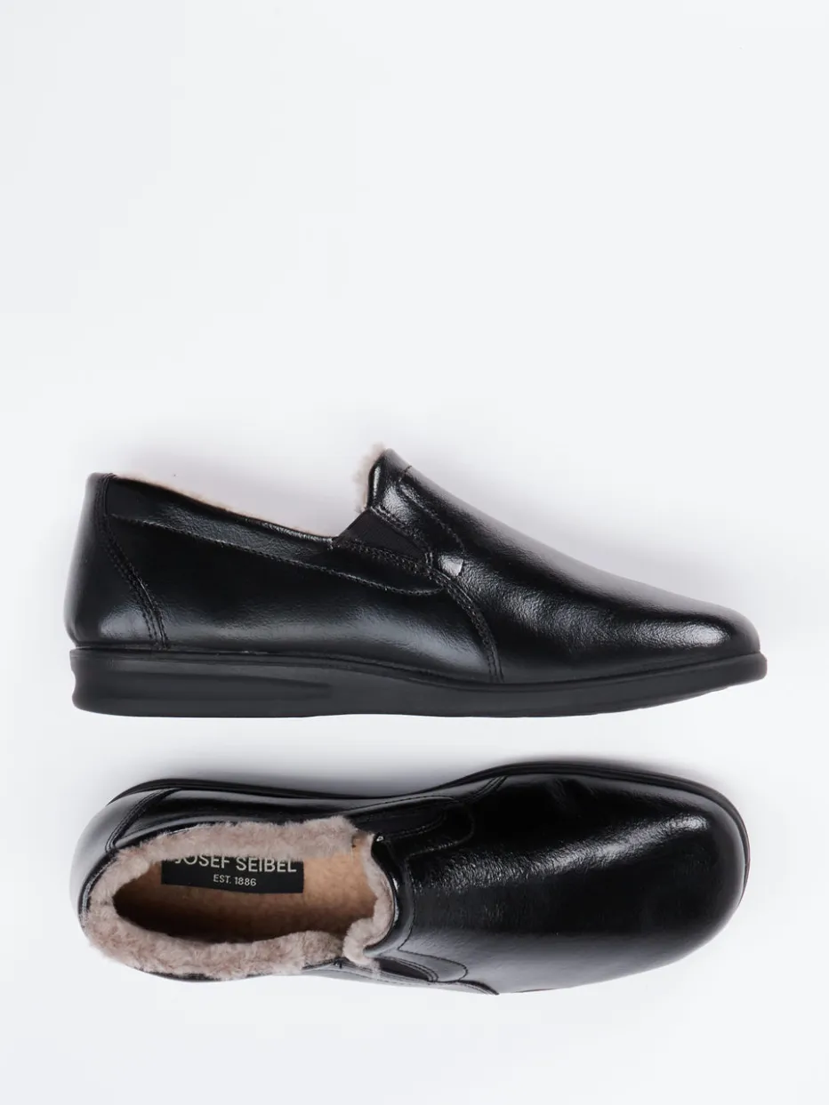 Kuscheliger Komfort für zu Hause.Josef Seibel Relax steht für hochwertige Damen-Hausschuhe mit durchdachtem Design. Ob für entspannte Stunden am Wochenende oder als täglicher Begleiter im Wohnbereich – dieser gefütterte Slipper vereint luxuriöse Gemütlichkeit mit stilvoller Zurückhaltung. Gefertigt aus edlem Kalbleder mit glänzend glatter Oberfläche zeigt sich das Modell in klassischem Schwarz mit tonalen Nähten und dezenten Elastikeinsätzen. Innen sorgt ein flauschiges Lammfellfutter für wohlige Wärme. Die Gummisohle verleiht Trittsicherheit auf glatten Böden und macht das Modell alltagstauglich. Inspiriert von „Quiet Luxury“ passt der Schuh ideal zum Cozy-Core-Trend. Wärmender Schlupfschuh mit zurückhaltender Eleganz von Josef Seibel Relax.