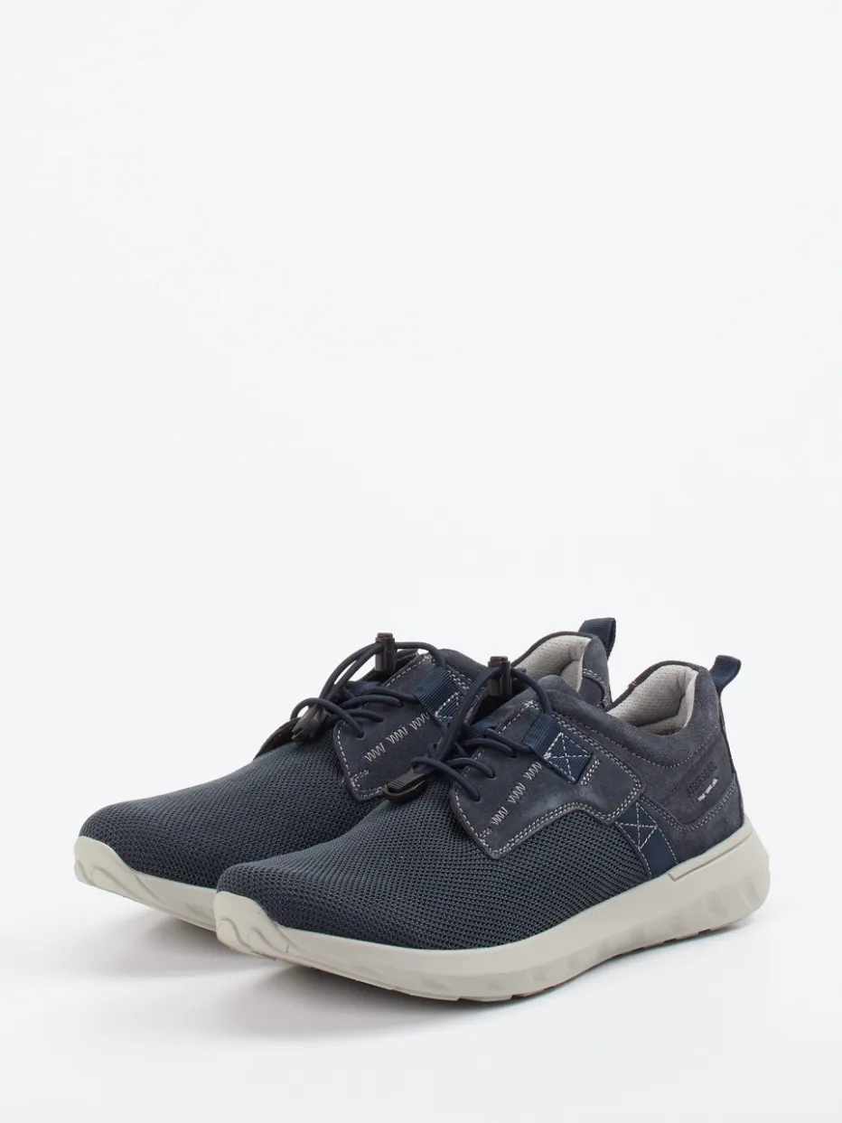 Sportliches Design trifft Alltagstauglichkeit.Der Herren-Sneaker von Josef Seibel überzeugt mit seiner gelungenen Fusion aus Komfort und moderner Lässigkeit. Ob auf dem Weg zum Café oder bei einem Spaziergang im Park – das leichte Obermaterial aus textiler Meshstruktur und samtig angeschliffenem Veloursleder sorgt für ein angenehmes Fußklima und rundet das atmungsaktive Gesamtpaket ab. Das dunkelblaue Design mit hellgrauen Akzenten und weißen Kontrastnähten wirkt zurückhaltend modern. Die elastische Schnellschnürung und die profilierte Gummisohle bieten sichere Stabilität. Minimalistische Linienführung und funktionale Details verweisen auf aktuelle Techwear-Einflüsse. Mit seiner sportflachen Silhouette steht der Sneaker für bewegten Komfort im urbanen Alltag – made by Josef Seibel.