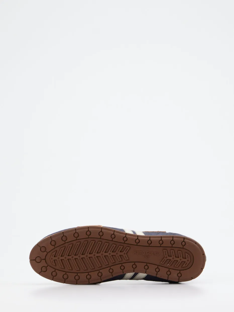 Retro-Vibes für urbane Freizeitlooks.Kamo Gutsu präsentiert einen Herren-Mid-Top Sneaker für Alltag und Reise mit stilvollem Charakter. Der Materialmix aus edlem Kalbleder und dunkelblauem Canvas mit matter Oberfläche sorgt für angenehmen Tragekomfort und visuelle Tiefe. Cognacfarbene Leder-Overlays und cremeweiße Kontraststreifen setzen markante Akzente im Stil aktueller Retro-Sneaker-Trends. Die klassisch-schmal geschnittene Silhouette mit mittelhohem Schaft und funktionaler Schnürung ergänzt sportlich-legere Streetwear-Styles. Die profilierte Gummisohle bietet dabei guten Halt. Ideal kombinierbar mit Jeans, Chinos oder leichten Sommerjacken. Ein Qualitäts-Sneaker für Freizeit und urbanes Styling mit sportlicher Eleganz von Kamo Gutsu.