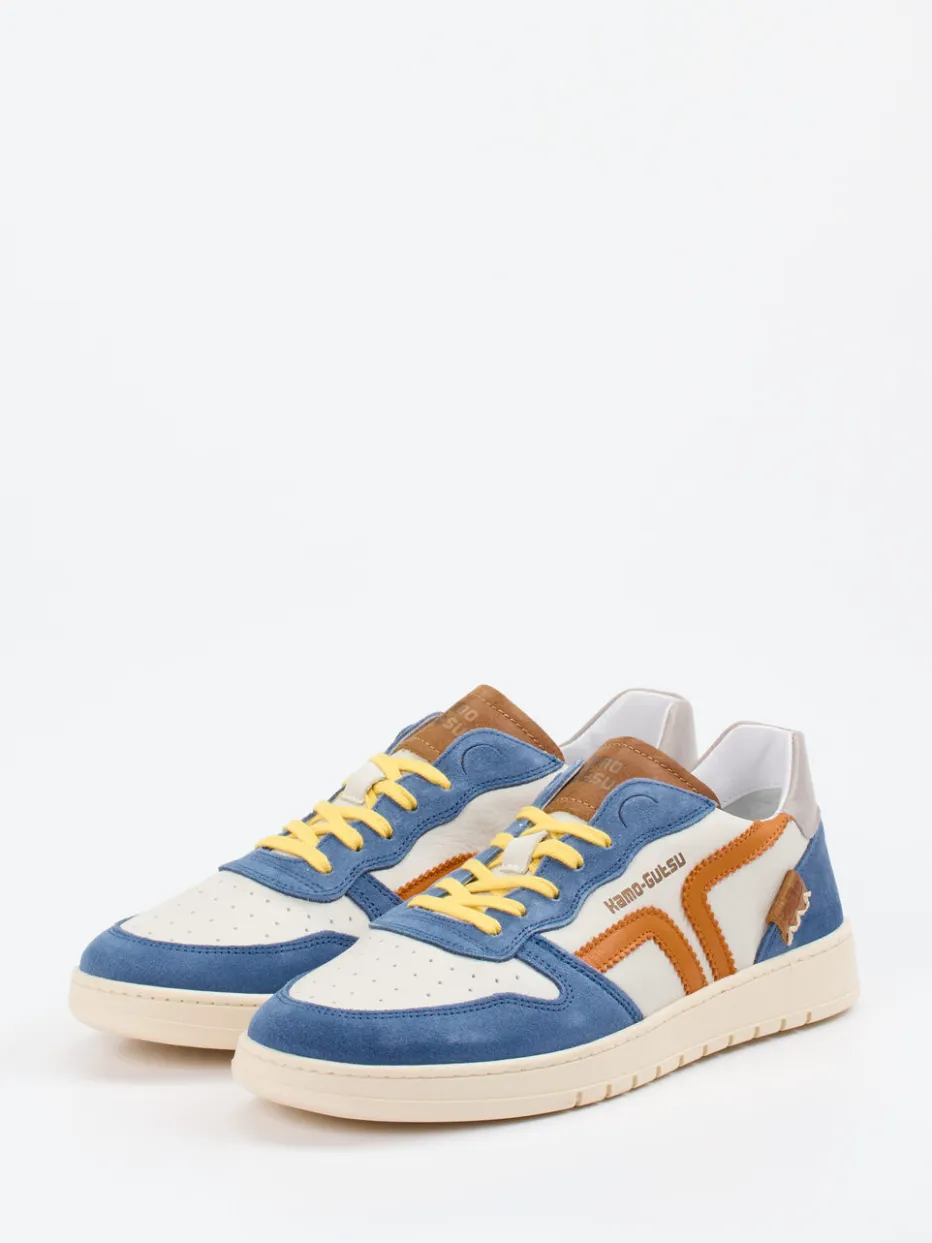 Design trifft Alltagstauglichkeit.Kamo Gutsu interpretiert mit diesem Sneaker die klassische Low-Top-Silhouette neu. Für stylische Stadtwege oder entspannte Freizeitmomente vereint der Schuh cremeweißes Veloursleder mit glatten Overlays in Cognac, Stahlblau und Orange. Die perforierte Oberfläche sorgt für Atmungsaktivität, während Kontrastnähte und sonnengelbe Schnürsenkel den Color-Blocking-Effekt unterstreichen. Der gepolsterte Schaftrand und das herausnehmbare Lederfußbett erhöhen den Komfort, die flexible Gummisohle erleichtert jeden Schritt. Ein Retro-inspirierter Streetwear-Sneaker für trendorientierte Looks. Mit stimmigem Design und Premium-Materialien unterstreicht Kamo Gutsu seine Liebe zum Detail.